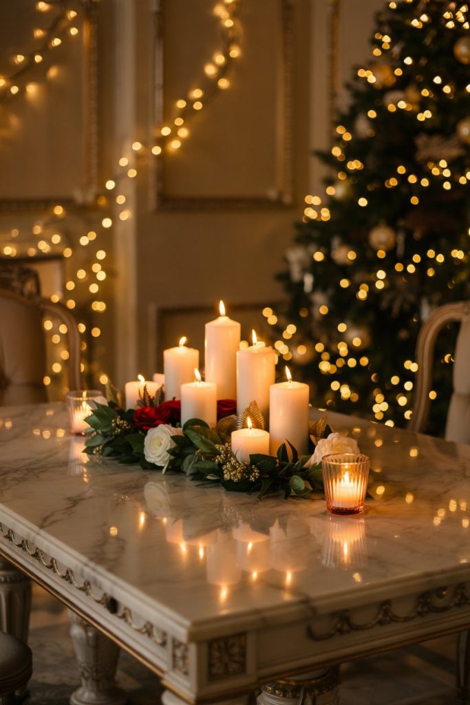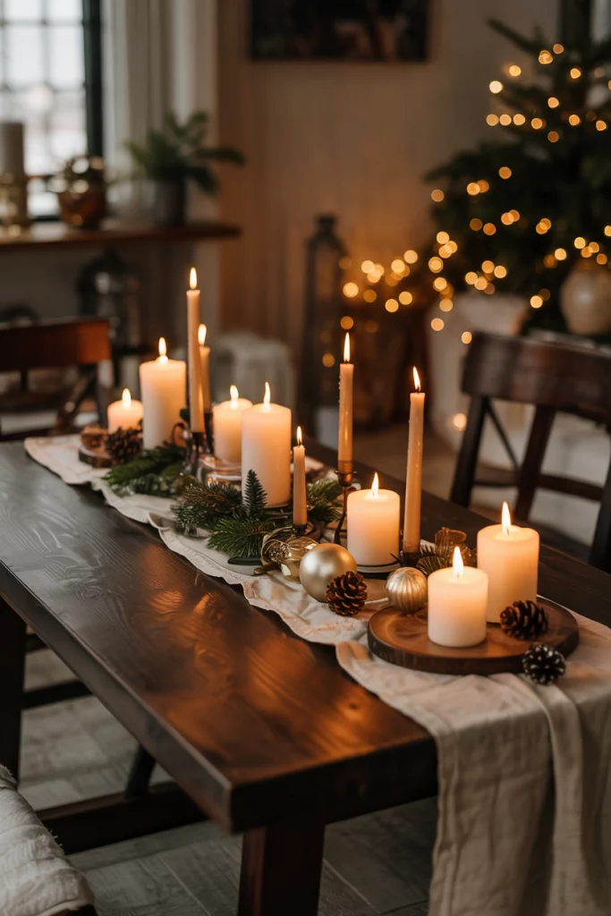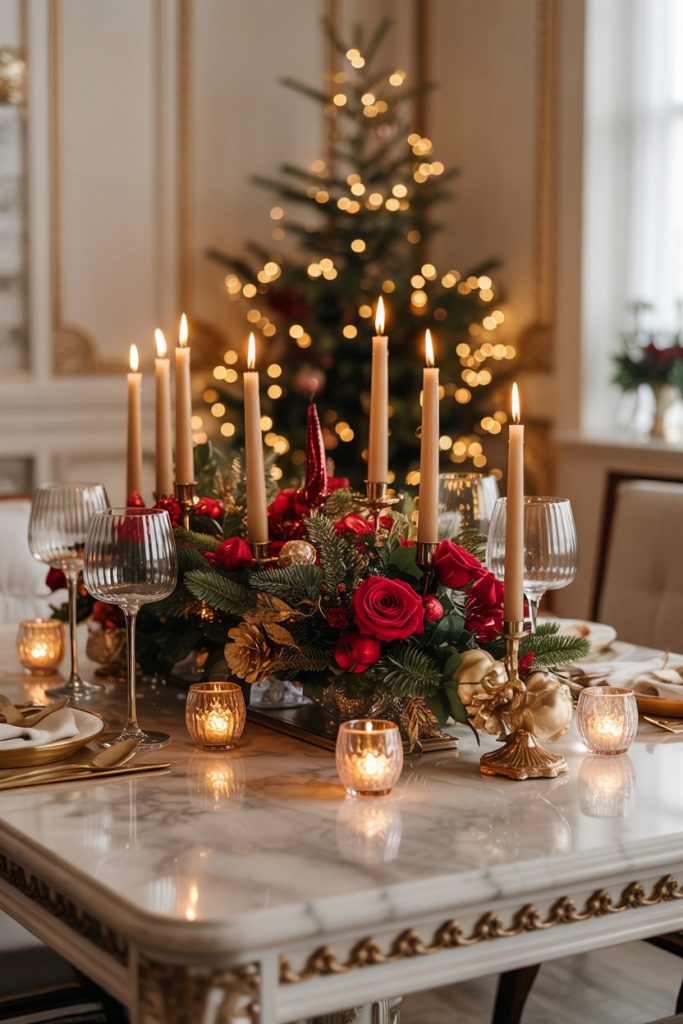 The marble and gold pairing dominates upscale dining trends. A rectangle or oval marble table accented with gold cutlery and candleholders creates instant luxury. This modern look pairs beautifully with soft lighting for intimate dinners or festive Christmas celebrations.