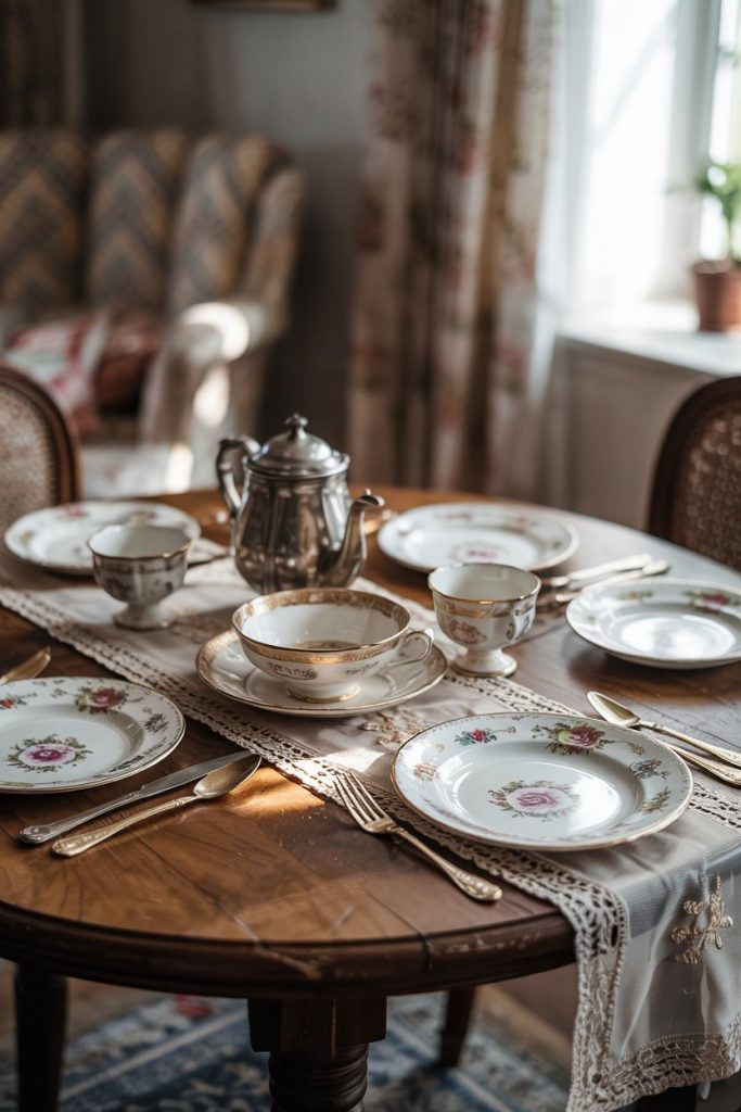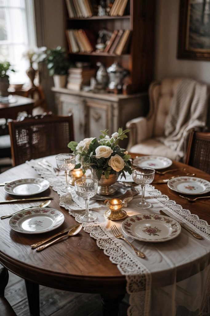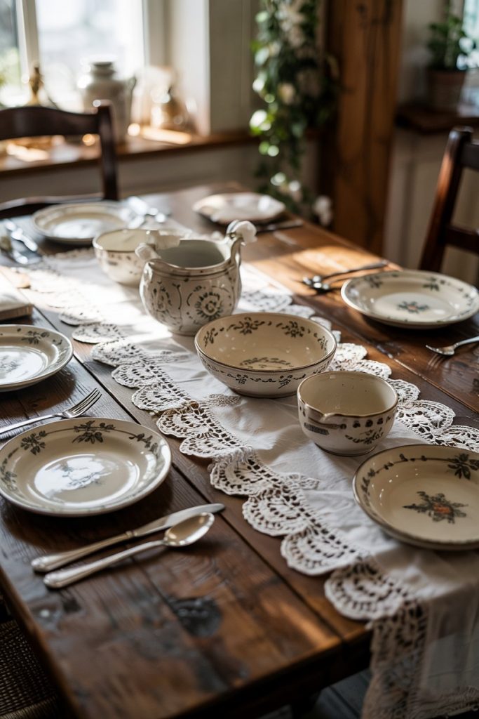A mix of vintage finds and farmhouse textures defines this nostalgic 2026 trend. Pair a distressed dark wood table with lace or embroidered runners. Use antique crockery for personality and charm—it’s cozy, heartfelt, and full of family history.