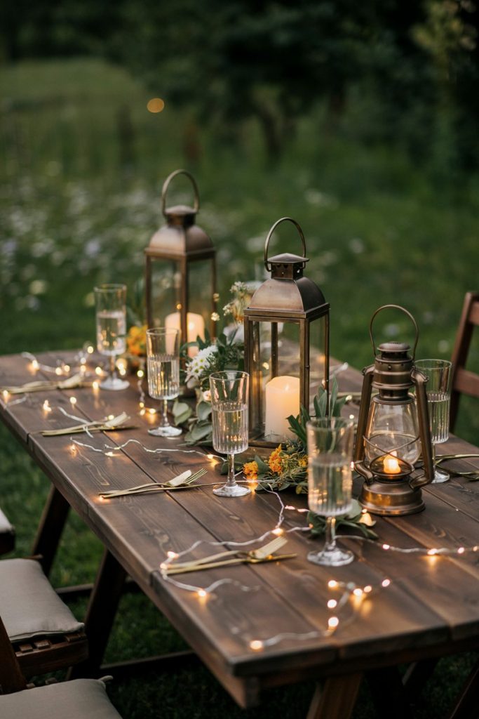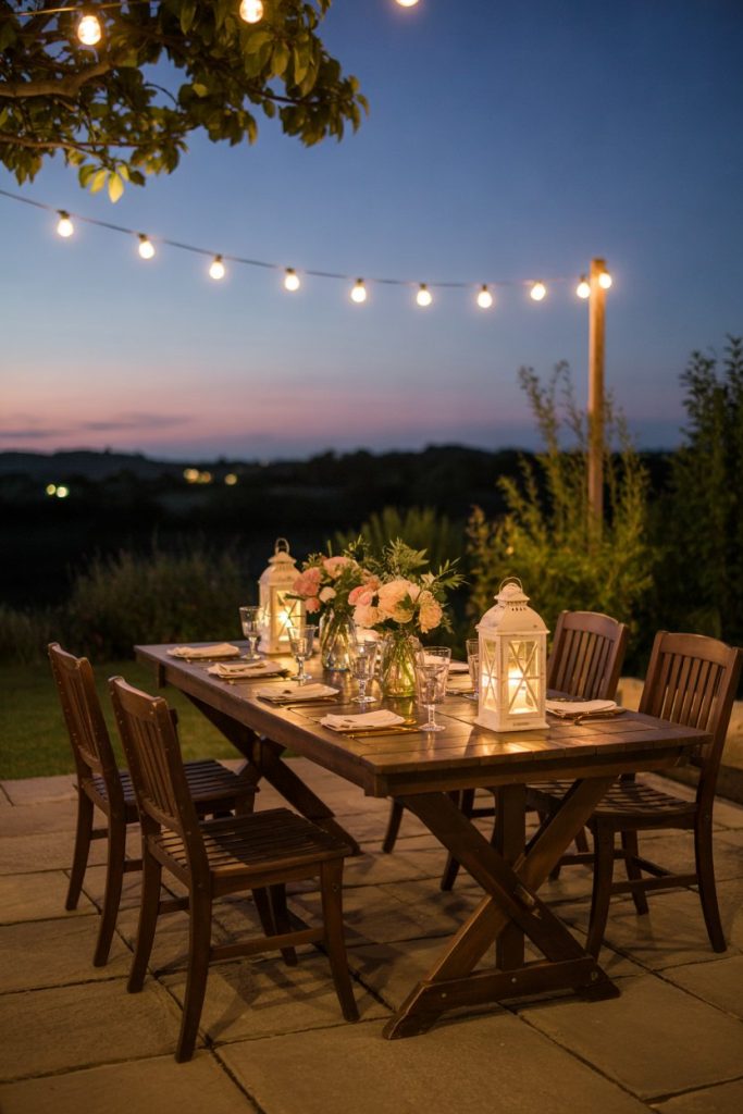 Take outdoor dining to the next level with glowing lanterns and wooden charm. A dark brown or wooden table surrounded by string lights creates unforgettable summer nights. Mix rattan chairs and glass details for a relaxed yet refined setup under the stars.