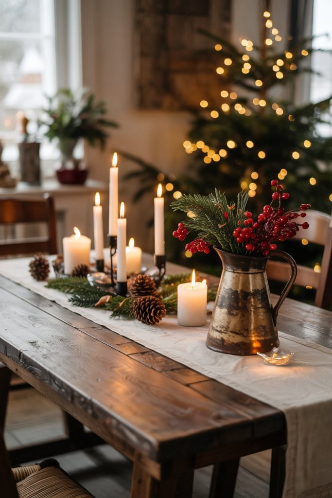 The farmhouse trend continues strong but shifts toward richer tones like dark wood or walnut. Combine with soft fabrics and vintage dishware for a space that feels grounded yet refined. A large wooden rectangle table becomes the centerpiece for family feasts or cozy Christmas dinners—rustic charm that never loses its magic.