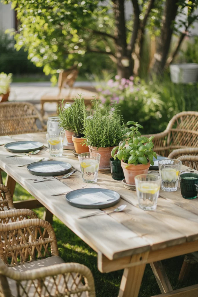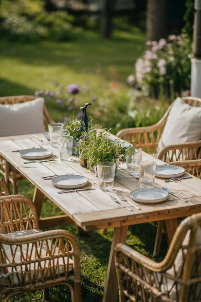 Outdoor dining transforms into an art form in 2026. Think sustainable wood, rattan, and glass details illuminated by sunlight. A simple herb centerpiece adds freshness and fragrance. This summer setup turns your patio into a peaceful escape—perfect for relaxed brunches or long, laughter-filled evenings under the sky.
