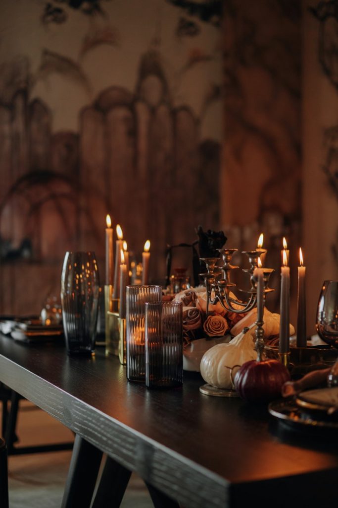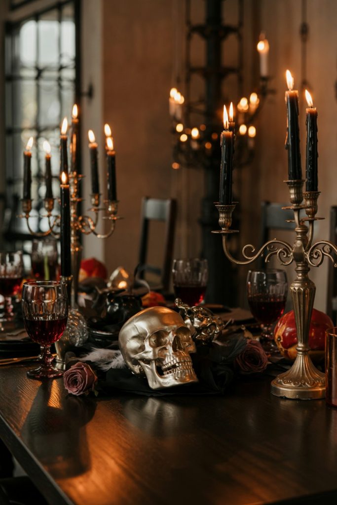 For Halloween, the trend leans toward sophisticated gothic themes. Black tables, dark candles, and smoky glass accents create dramatic contrast. A moody centerpiece—like dried flowers or black feathers—adds mystery. Blend in dark wood or oval elements for depth, turning spooky into stunningly chic.