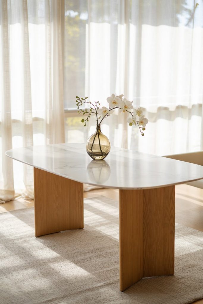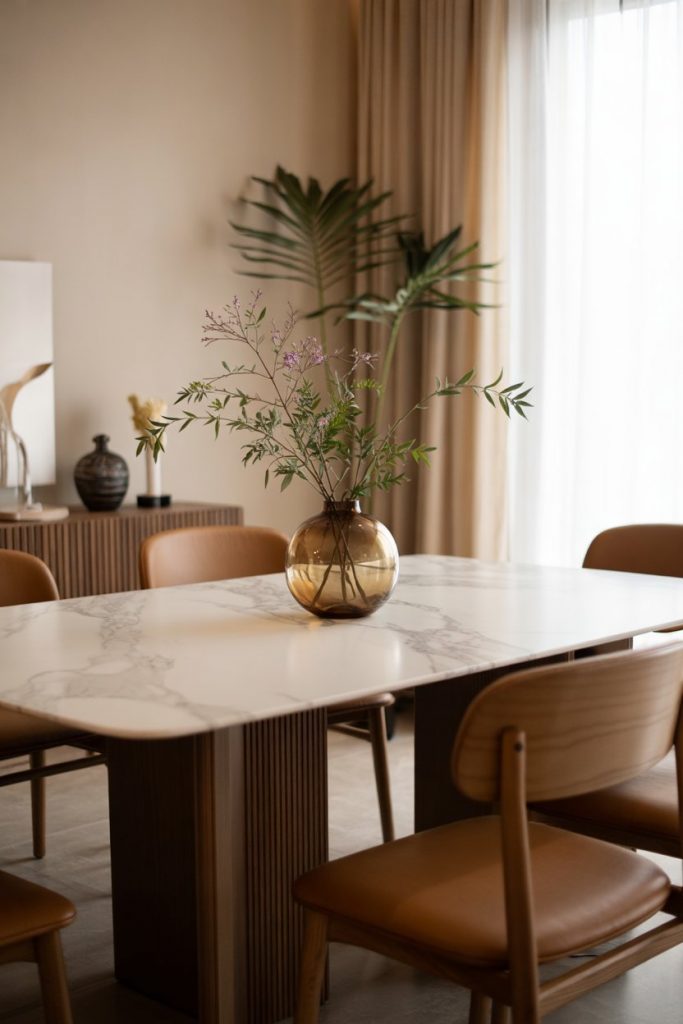 The marble dining table gets a fresh revival in 2026. Instead of cold opulence, designers mix wood details and soft tones to warm the look. A glass vase with simple flowers adds balance. This style fits the modern apartment dweller who values both luxury and livability in their decor.