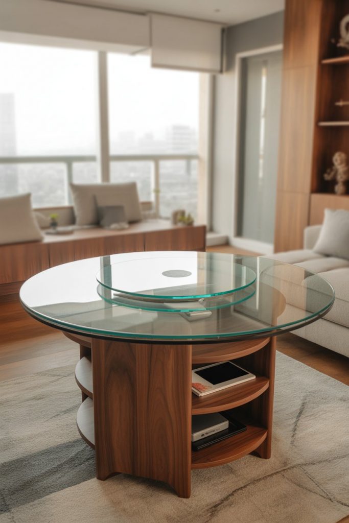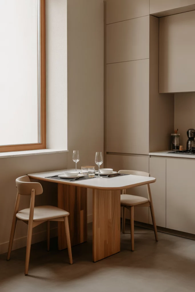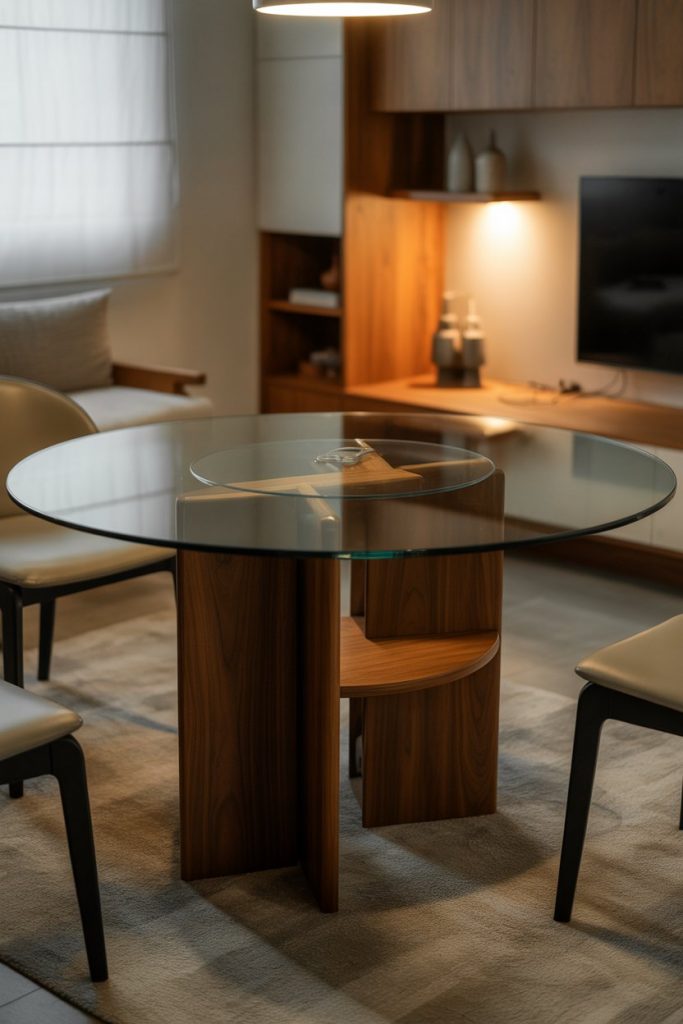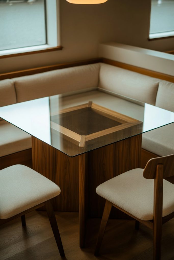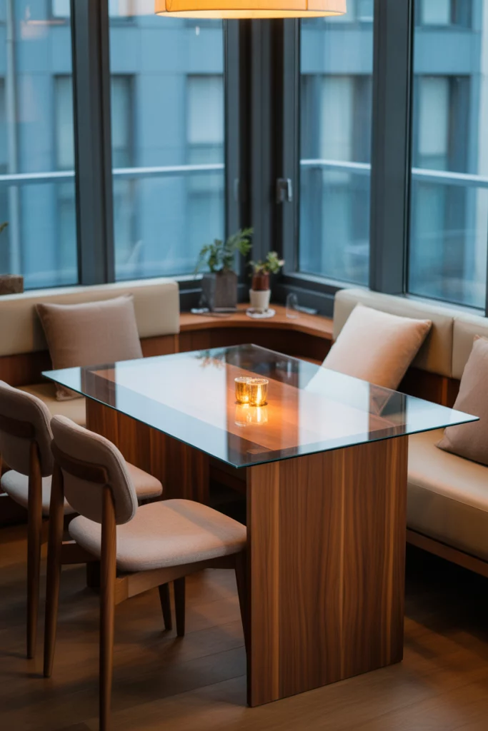 A corner table transforms unused nooks into intimate dining areas. Choose wooden or modern luxury wood models with glass overlays to keep the space open and bright. This idea works especially well in small living rooms or apartments where you want a dedicated dining spot without dominating the floor. Built-in benches or storage add functionality — something Architectural Digest predicts will trend heavily through 2026.