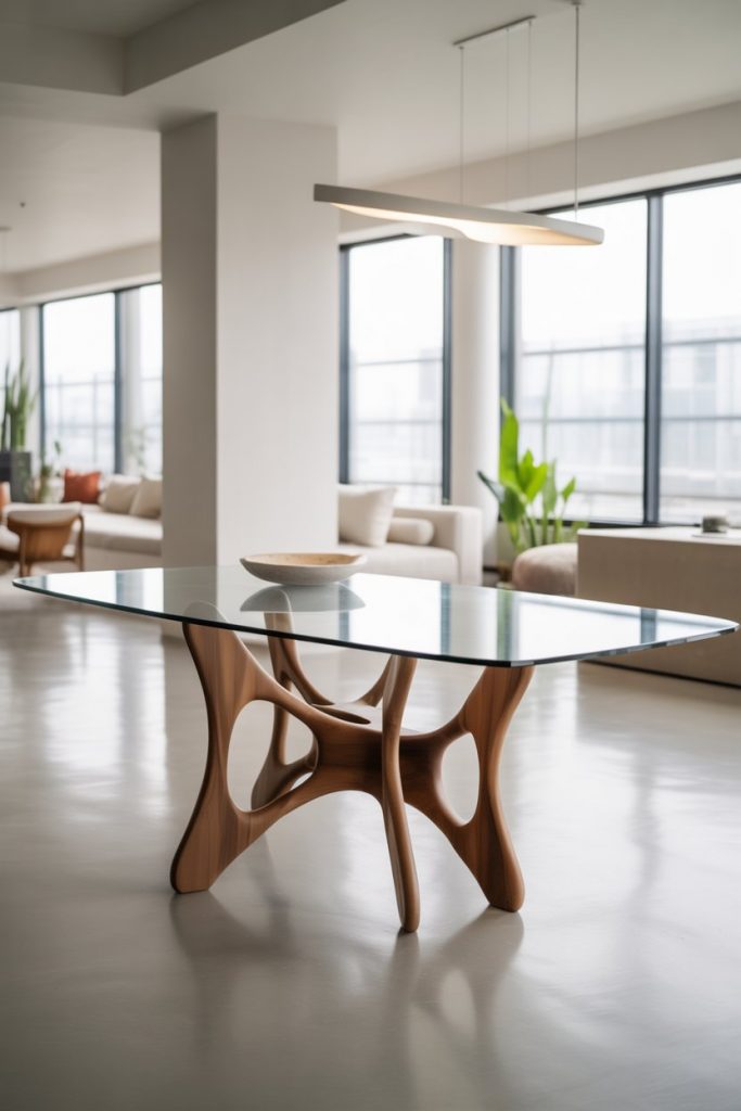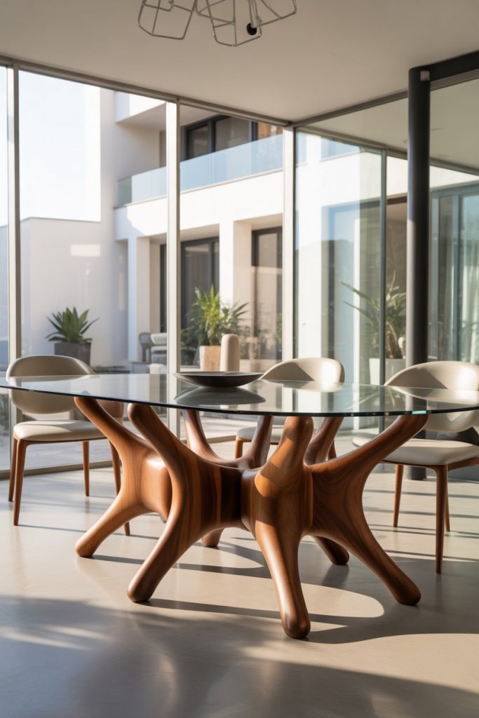 The fusion of glass and wooden textures continues to dominate 2026 dining design. A clear top reveals the craftsmanship beneath, whether carved modern luxury wood legs or sculptural bases. Ideal for small living rooms or apartments, this table adds lightness without sacrificing warmth. The transparency also complements white or black accents beautifully, creating balance in minimalist interiors.