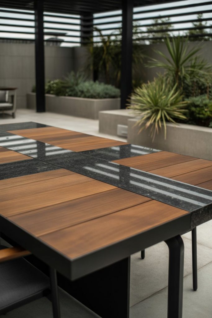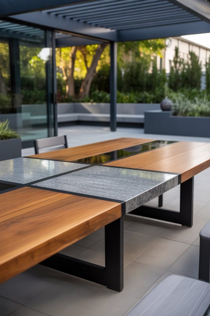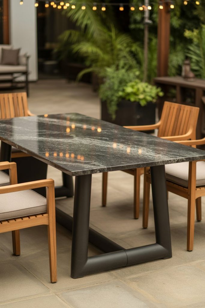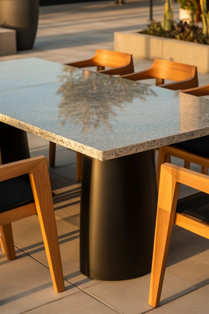 Durability meets luxury with granite patio tables, built to handle weather while keeping a modern aesthetic. 2026 models often feature black or bronze bases, adding bold contrast. Perfect for outdoor dinners or poolside brunches, this table stands out as both a sculpture and a social centerpiece. Its cool surface pairs beautifully with natural wood seating.