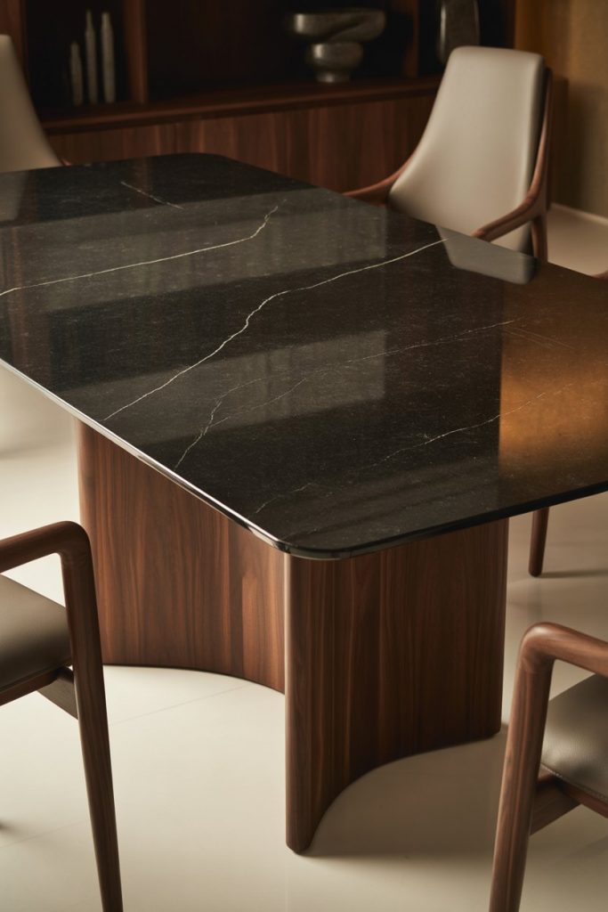 Few materials rival modern luxury wood for sophistication. Rich tones, subtle grain, and perfect finish make it ideal for statement dining. This 2026 trend highlights craftsmanship — walnut, oak, and teak dominate collections by leading brands. It pairs beautifully with glass, black, or white accents, turning any dining area into a refined retreat.