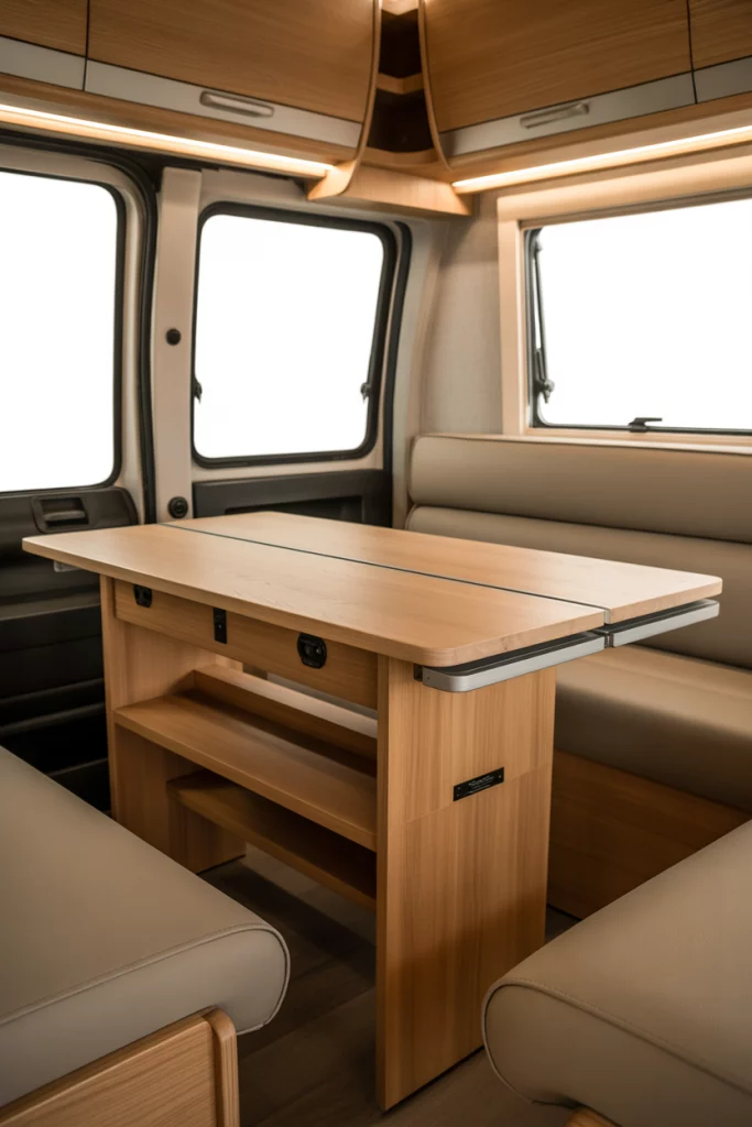 In 2026, mobility meets design in RV dining setups. These folding, convertible tables transition from dining surfaces to desks or sleeping platforms. Crafted from lightweight wooden materials with modern finishes, they appeal to travelers and minimalist homeowners alike. Vanlife blogs highlight their charm — blending practicality, adventure, and design in motion.
