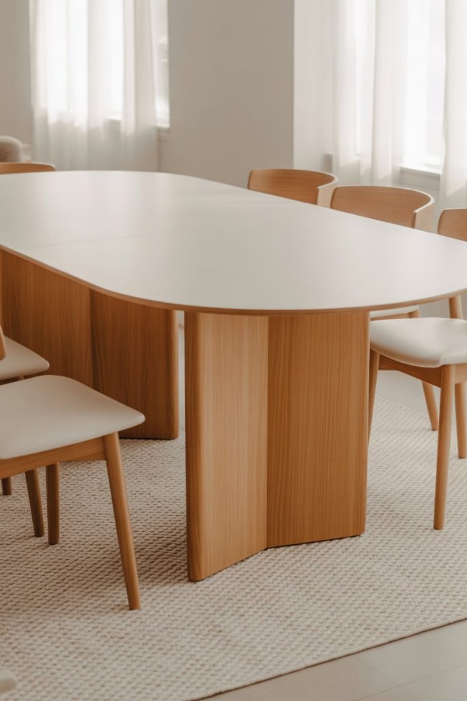 A white dining table brings calm, clarity, and light to any interior. In 2026, modern luxury wood legs with white lacquered tops define Scandinavian minimalism. Perfect for small spaces or apartments, this design expands perceived area while staying clean and bright. Pair it with a neutral rug under for harmony and warmth. As Domino magazine notes, white furniture reflects serenity and timeless taste.