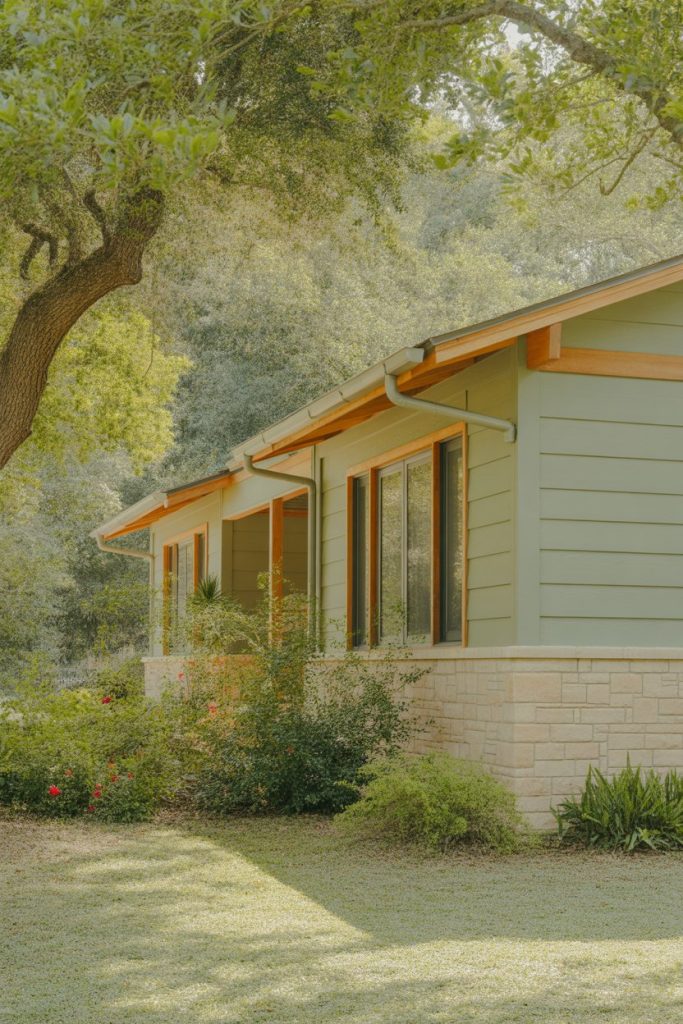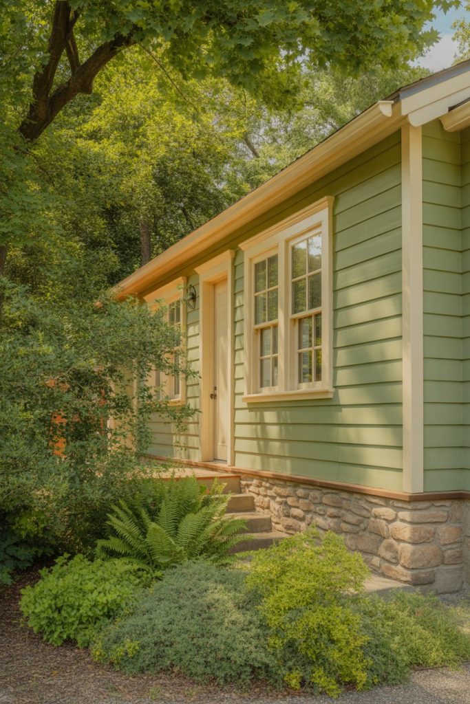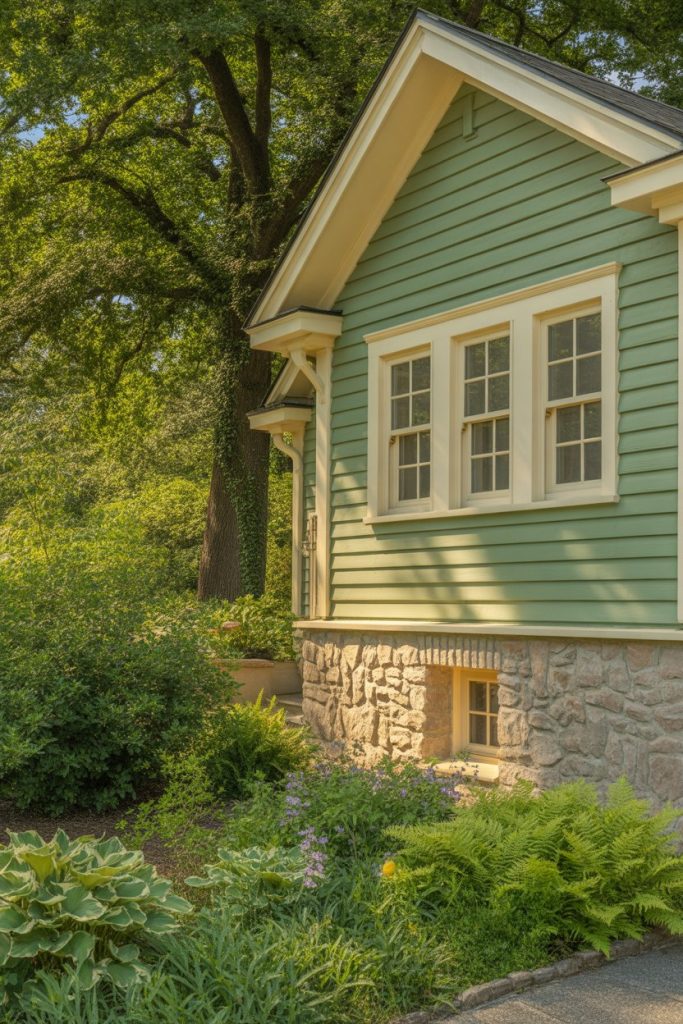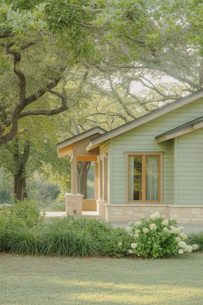 Sage green continues to rise in popularity thanks to its soft, nature-inspired calm. This earth tone blends muted green and gray, perfect for siding or shutters paired with cream trim and natural stone. In 2026, design experts like Studio McGee highlight sage green as a warm alternative to beige, bringing freshness to modern cottages and suburban homes.