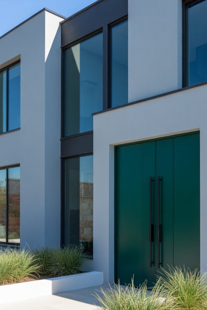 For those who love depth, dark green adds sophistication and a moody charm. It looks stunning on doors, shutters, or entire façades with contrasting beige or gray walls. This modern tone harmonizes with brown or stone textures, creating an elegant and timeless atmosphere. Designers like Kelly Wearstler emphasize how dark hues anchor spaces — the same works perfectly for exteriors.