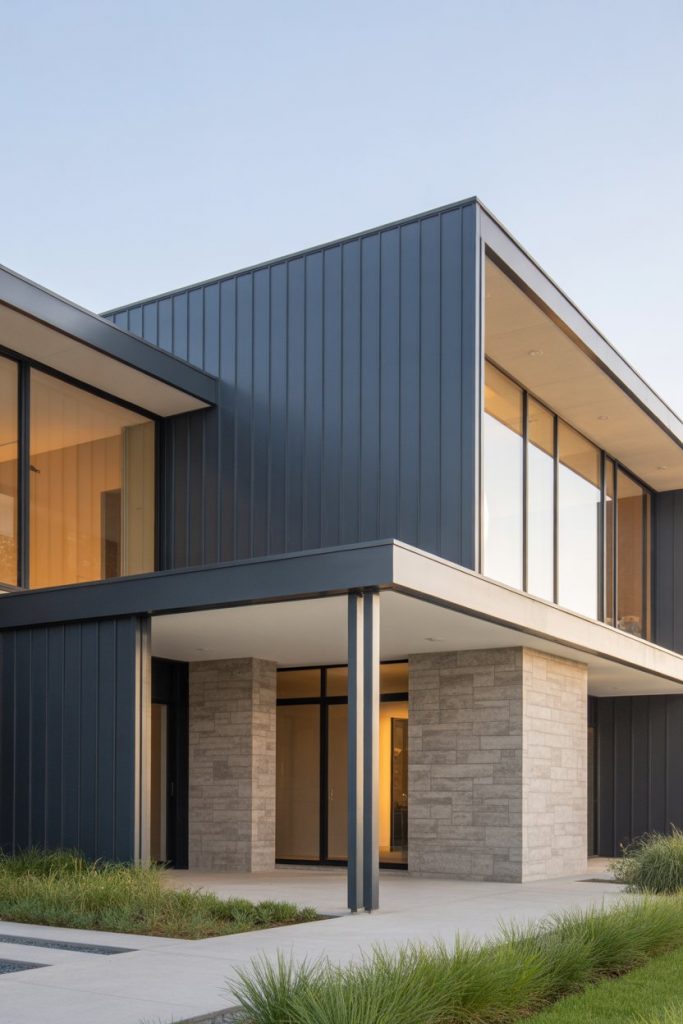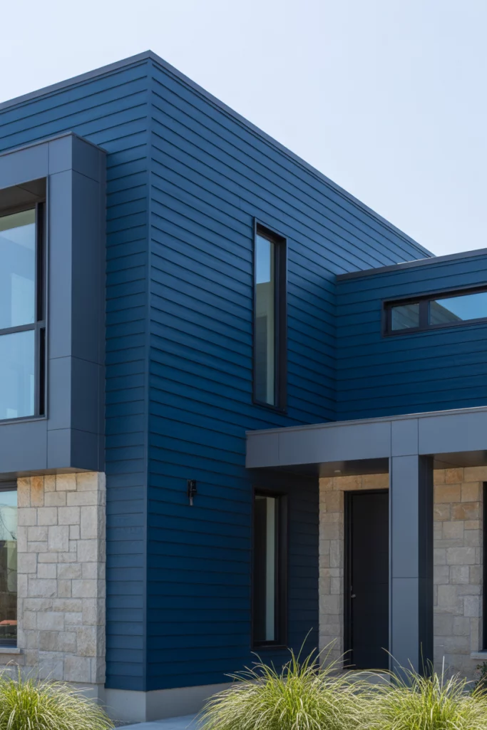 A dark blue façade makes a bold yet classic statement. This moody color works well on contemporary homes with stone, gray, or cream elements, giving a sense of confidence and artistry. Designers note that navy shades have replaced the once-dominant black trend — providing richness without starkness. It’s perfect for homeowners wanting dramatic curb appeal.