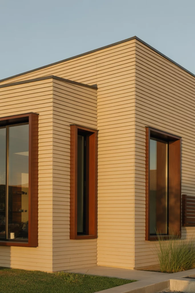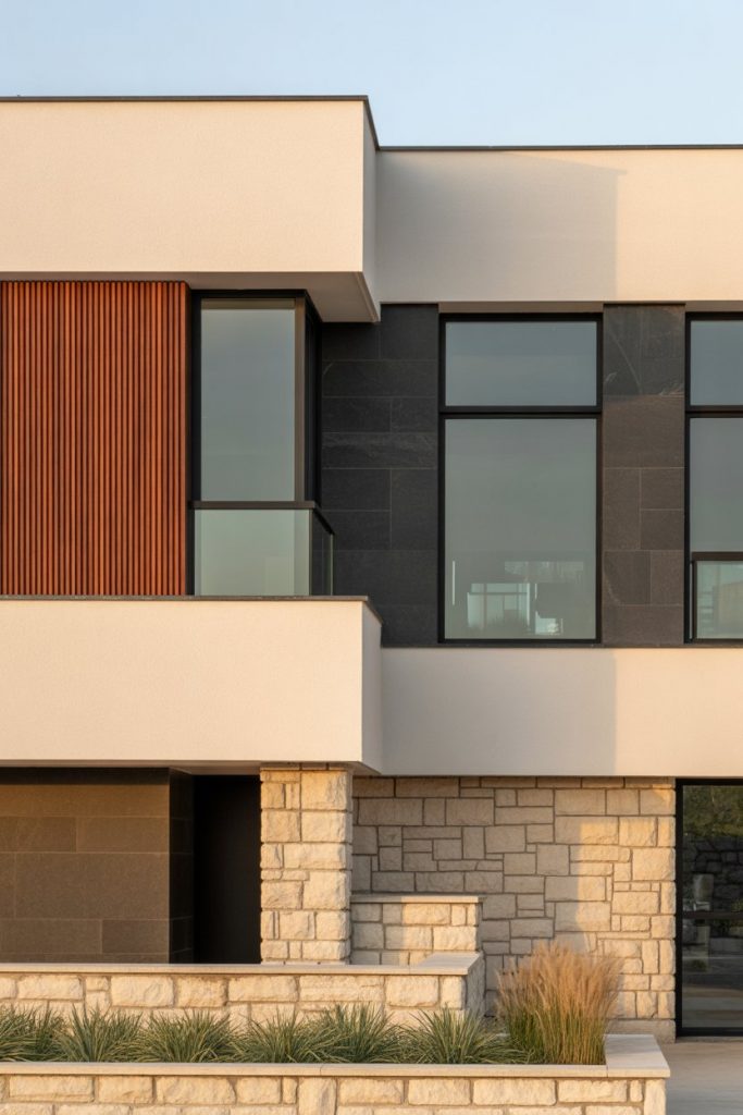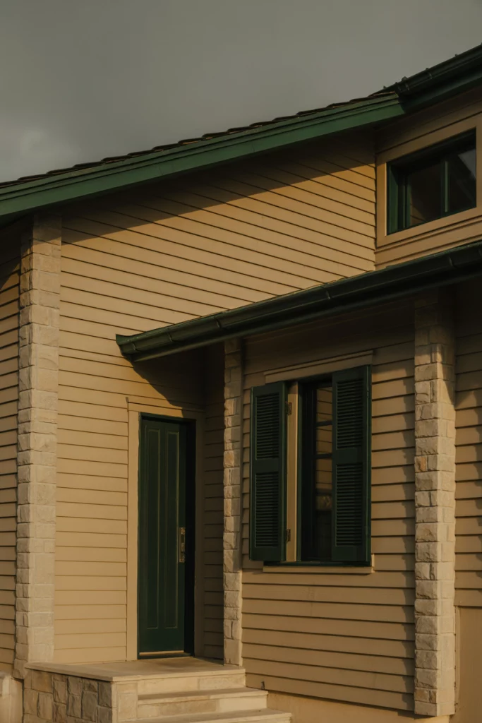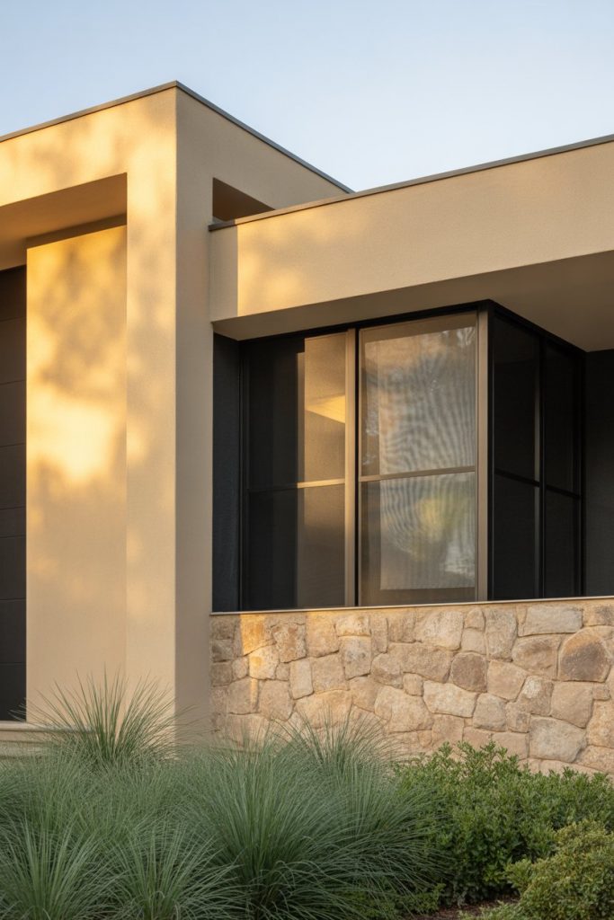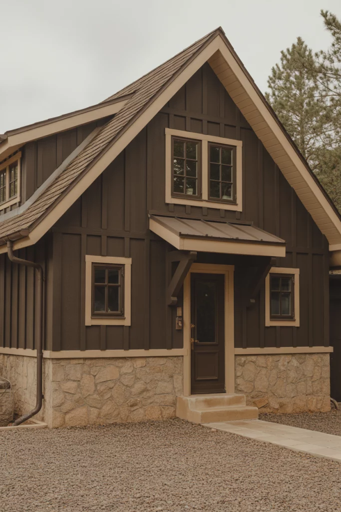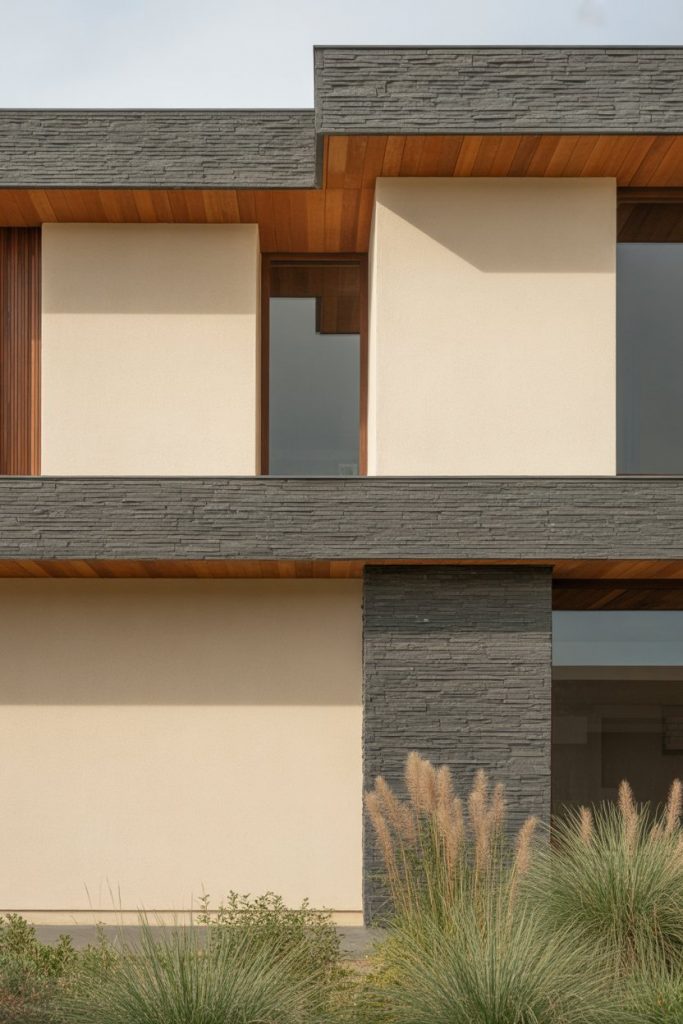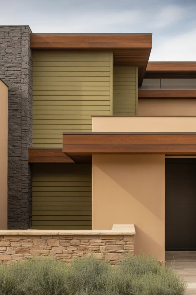 Combining beige siding with stone foundations reflects a natural earth tone minimalism popular in modern architecture. It gives homes a grounded, elegant presence that integrates with the landscape. This look, often seen in mountain or desert settings, blends strength with serenity.
