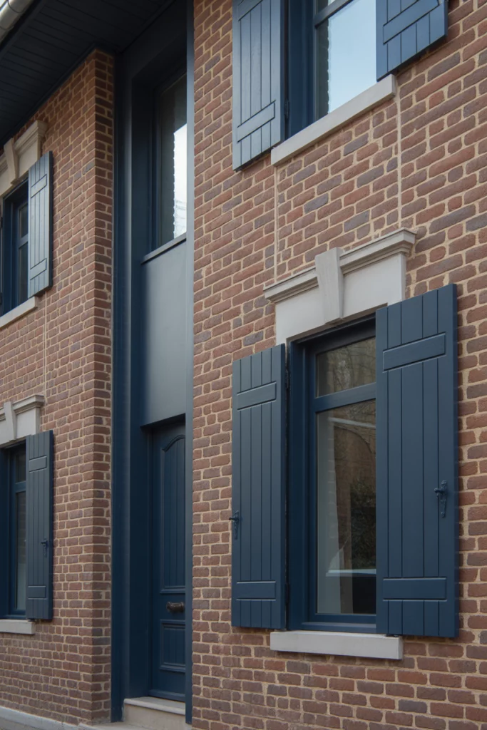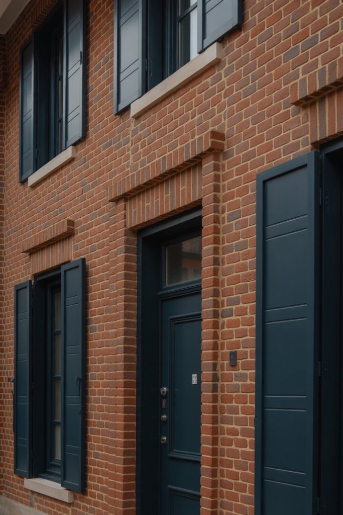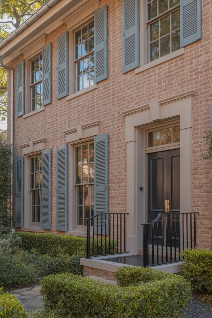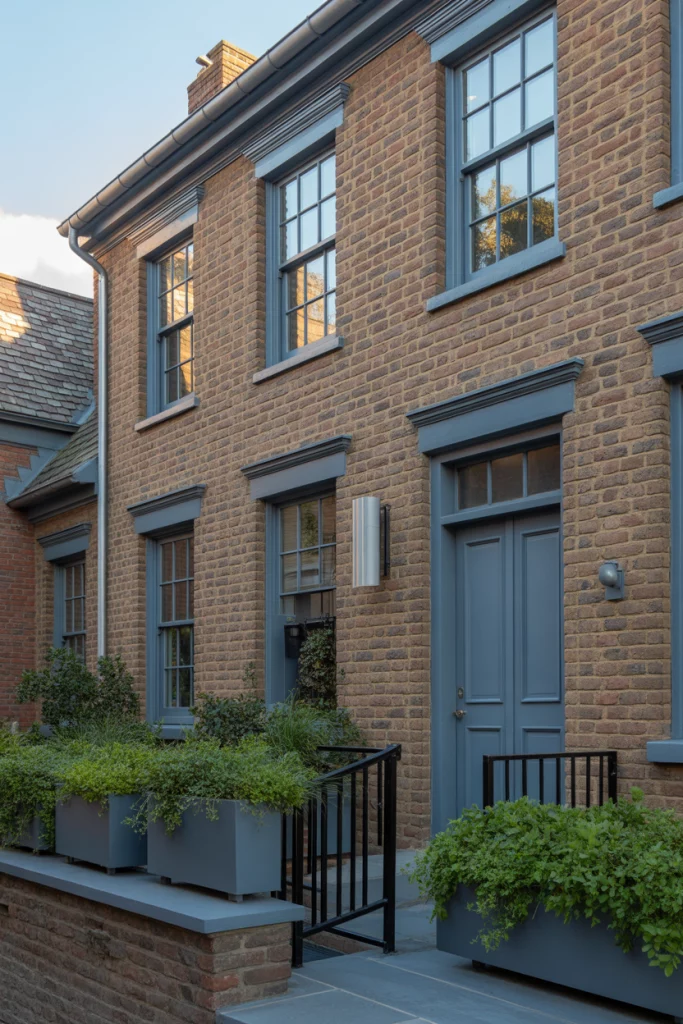 Pairing blue with brick is a bold way to modernize tradition. Deep dark blue doors or shutters against red brick walls create visual excitement while staying classic. This combination, featured in design blogs like Houzz, merges urban chic with timeless warmth, perfect for transitional architecture.