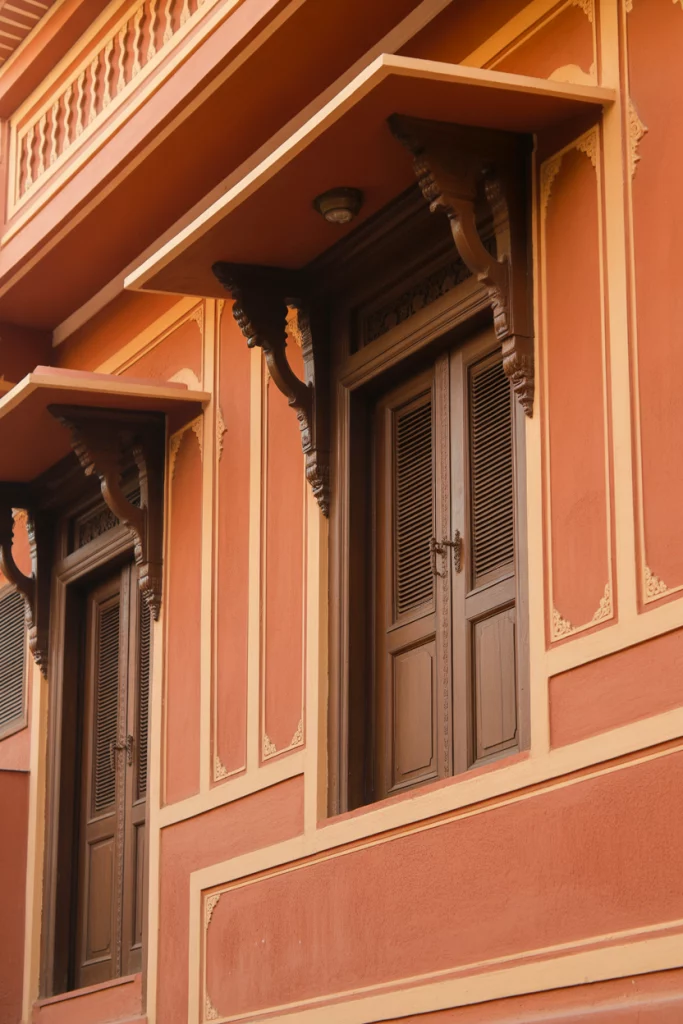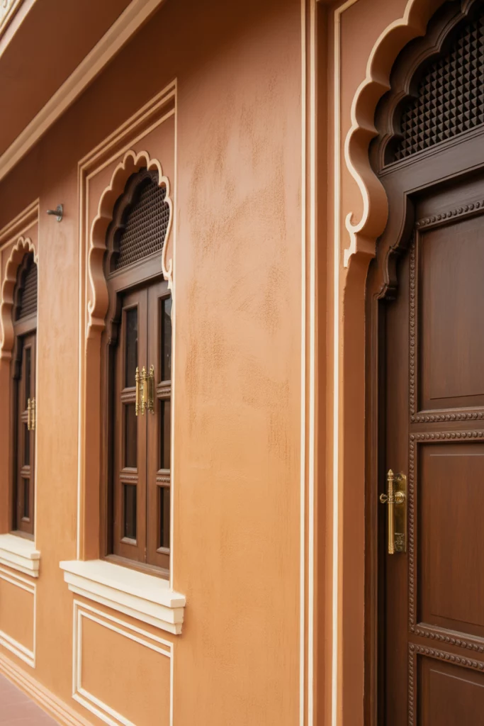 Indian style exteriors in 2026 highlight rich, sun-baked hues — from terracotta to brown and soft cream. These warm palettes draw from traditional Indian architecture, celebrating texture and craftsmanship. Combined with carved wood doors or latticework, they create depth and cultural character.