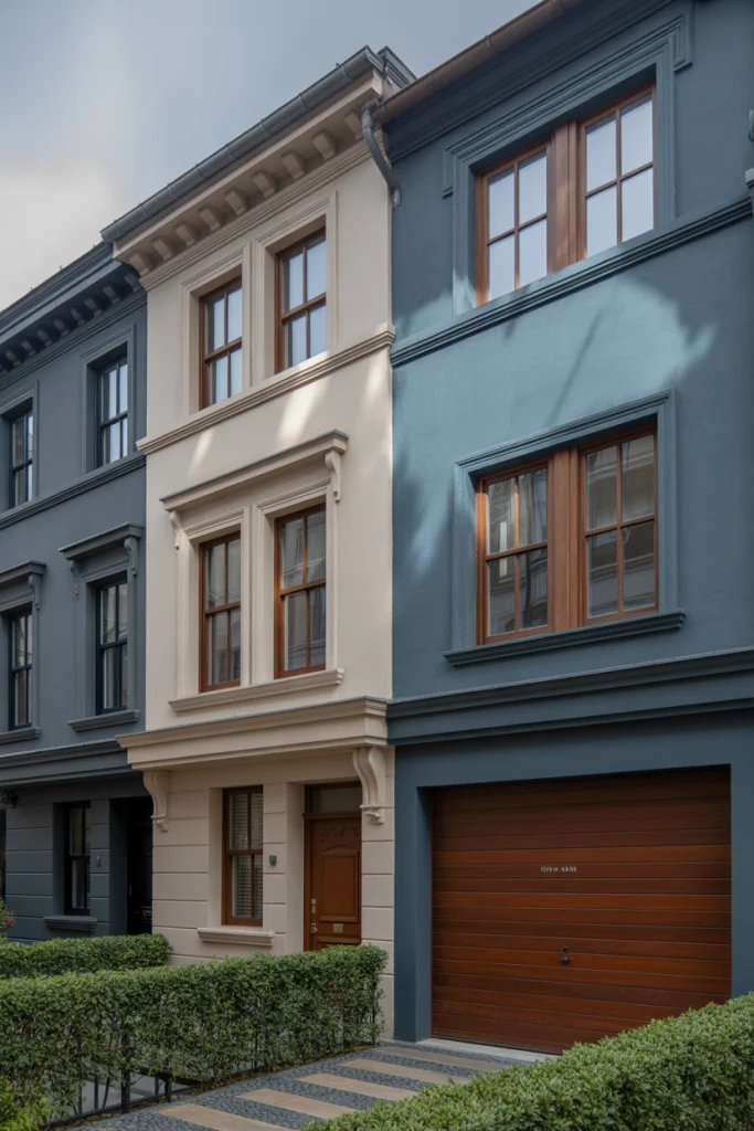 The fusion of blue gray and dark undertones creates a moody, luxurious exterior perfect for modern townhouses. It pairs well with cream or brown accents for balance, offering a timeless yet bold look. Designers like Emily Henderson often highlight this palette for its cinematic and refined mood.
