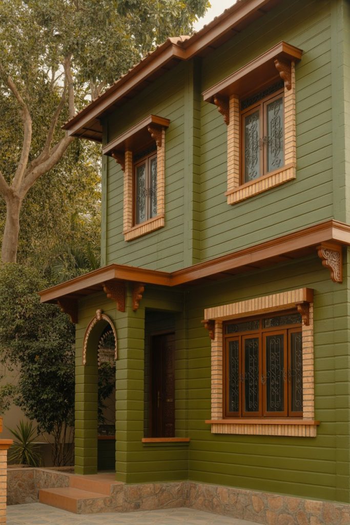 A light green paired with beige creates a soothing and welcoming exterior. This combination reflects earth tone harmony and suits both country homes and modern townhouses. The soft contrast highlights natural surroundings and feels fresh without being loud — a perfect reflection of the 2026 calm design direction.