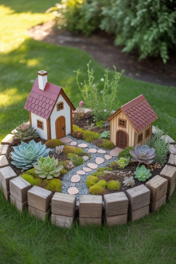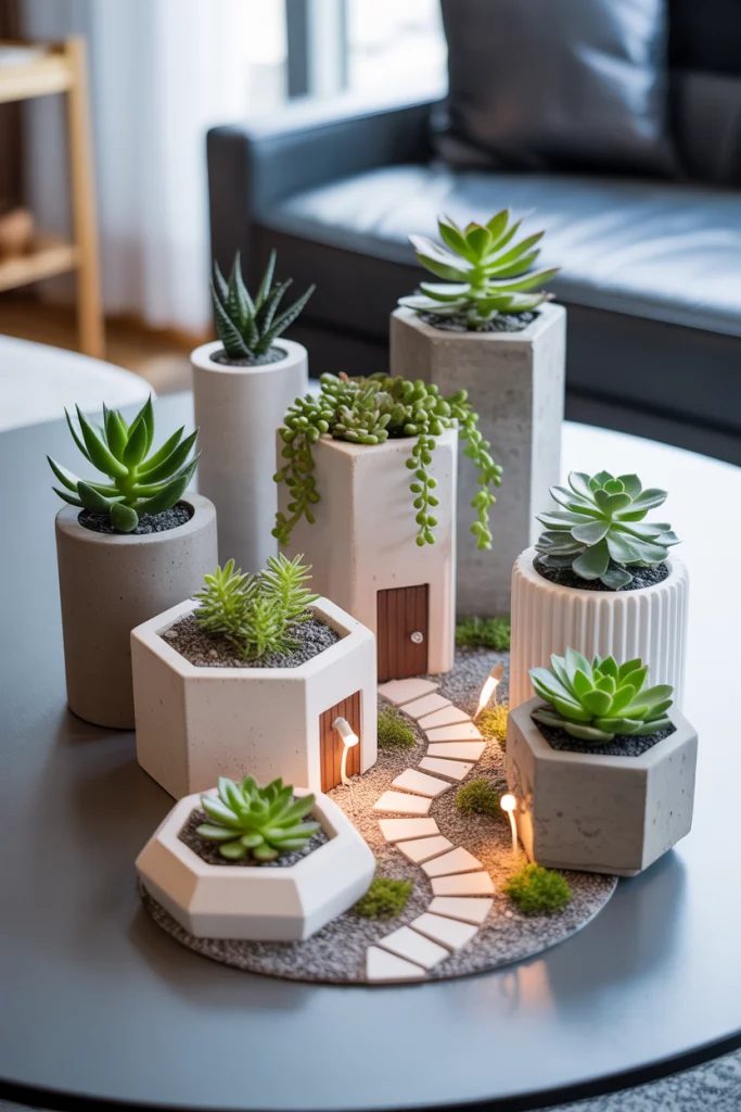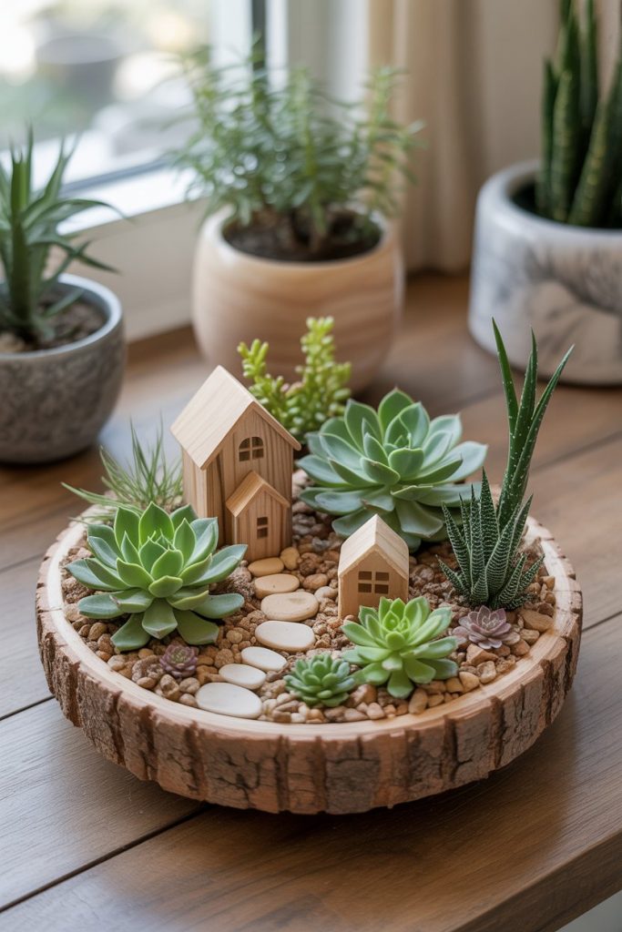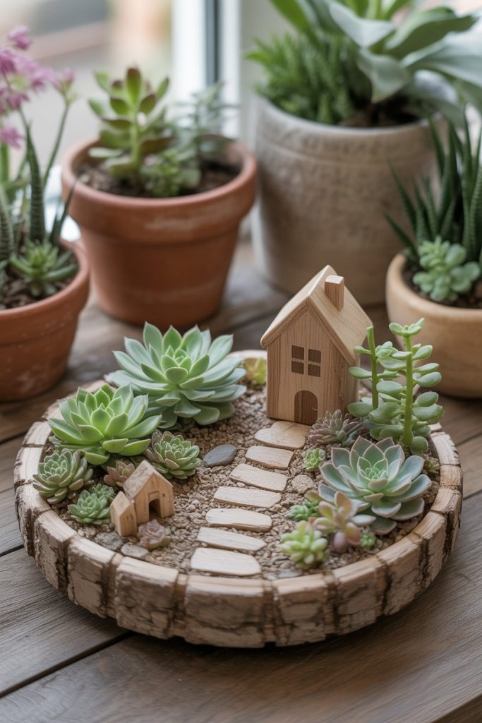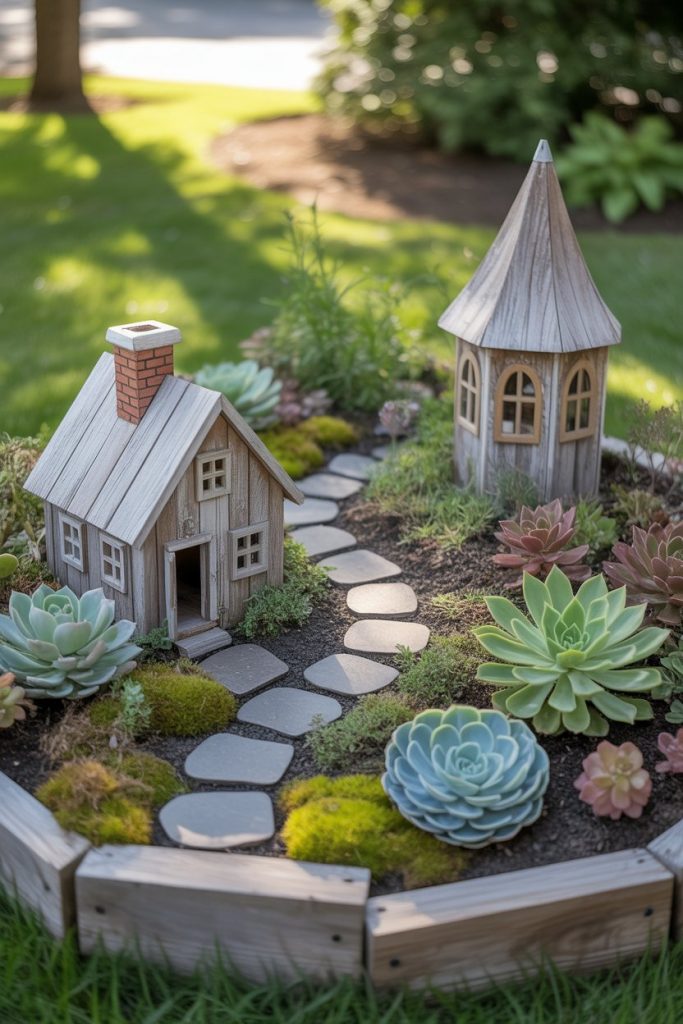 Creating a village made entirely of succulent varieties brings a fresh, modern twist to fairy gardens. Pairing geometric pots, sand, and miniature paths makes the setup feel clean and sculptural. Garden designers love this indoor or outdoor idea for its low maintenance and contemporary look, perfect for adults who prefer minimal but magical décor.