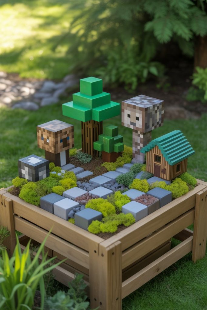 A fairy garden built in the Minecraft style exhibits the game in stitched stones, rounded and squared houses, and other foliage in bright colorings. This crafted masterpiece is especially desirable amongst kids and newcomers to the growing design community who thrive in the arena of traditional craft with a digital twist. It makes for a wonderful addition to outdoor spaces and is equally ideal for small craft pots. This wonderfully crafted piece is always a combination of creativity and nostalgia.