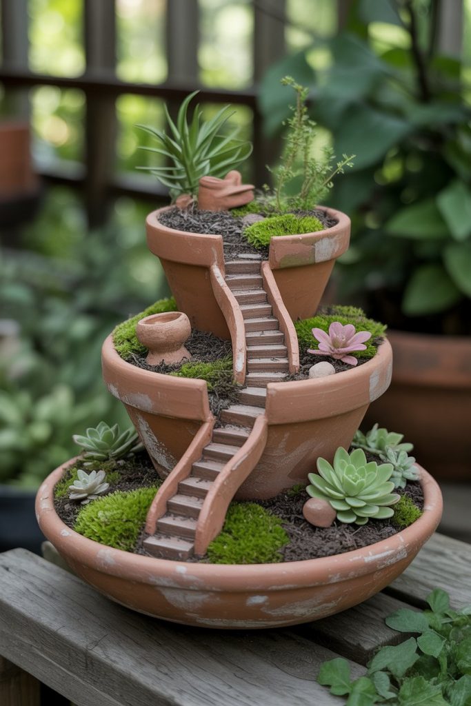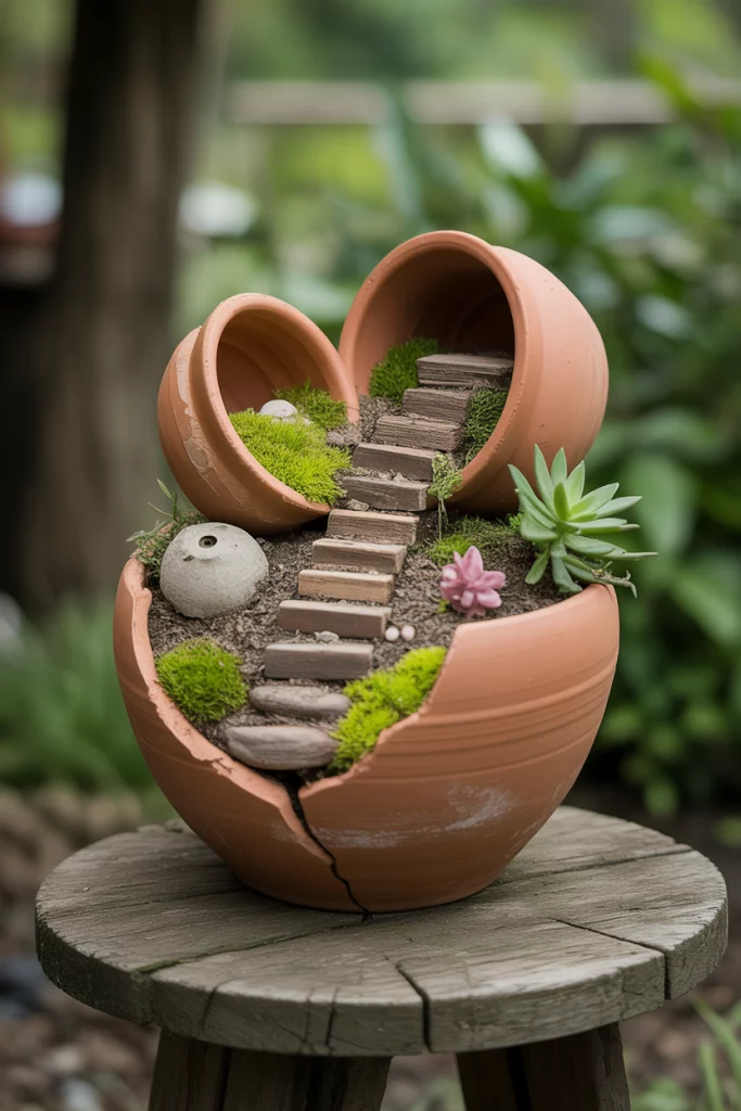 A broken small pot can become a creative multi-level fairy landscape by stacking the shards into terraces. This DIY method is popular among gardeners who enjoy turning damaged items into charming scenes. Adding moss, gravel, and miniature stairs creates a cascading design that feels whimsical and artistic while staying compact enough for balconies and porches.