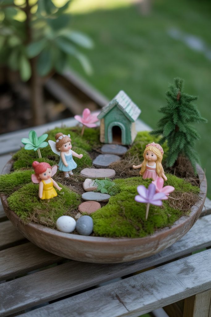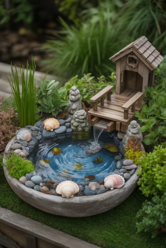 Using a low basin filled with stones and tiny water features creates a relaxing, nature-inspired fairy world. Small LED ponds, shells, and miniature bridges make it feel peaceful and spa-like. Many bloggers say this outdoor idea works beautifully near patios or seating areas, offering gentle sound and texture while staying low-maintenance.