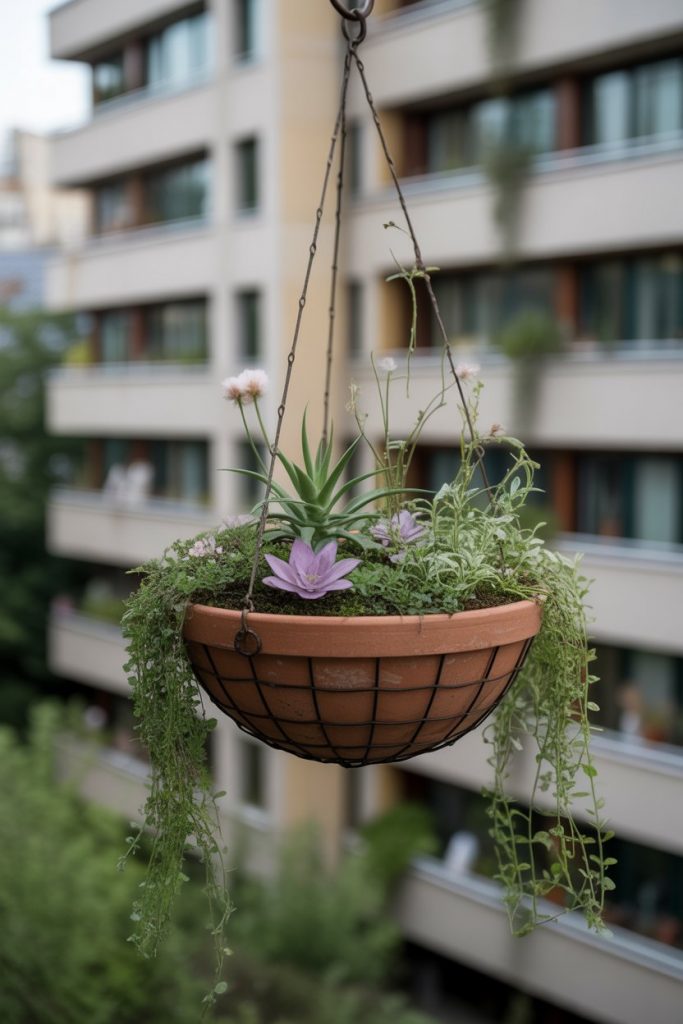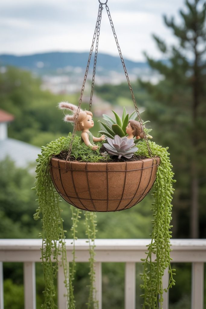 Hanging pots give fairy gardens height and movement, making them perfect for patios or balconies. Using trailing plants and miniature accents creates a floating world that feels airy and playful. This outdoor idea is especially helpful for small spaces where floor room is limited but vertical areas can shine with creative displays.