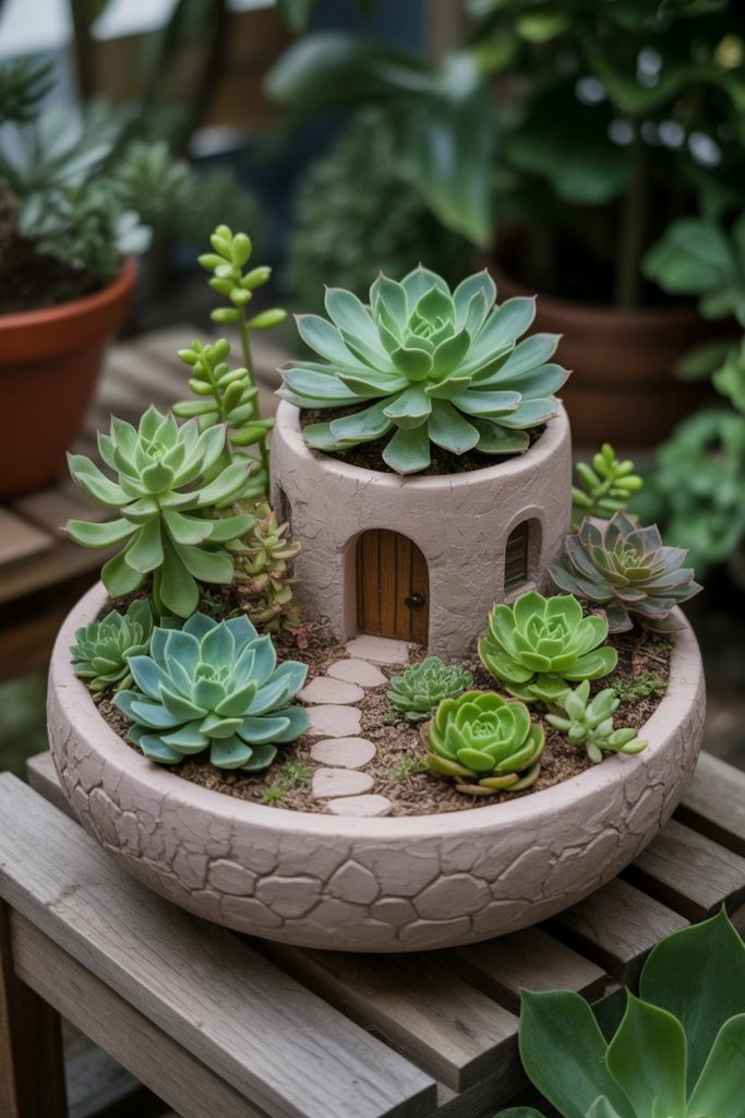 A succulent fairy garden blends low-maintenance plants with charming miniature décor. Succulents add structure and texture, making this design ideal for busy adults who want greenery without constant watering. Using gravel paths, wooden pieces, and tiny cottages creates a natural, calming world that works indoors or outdoors. Bloggers love recommending it for its durability and earthy appeal.