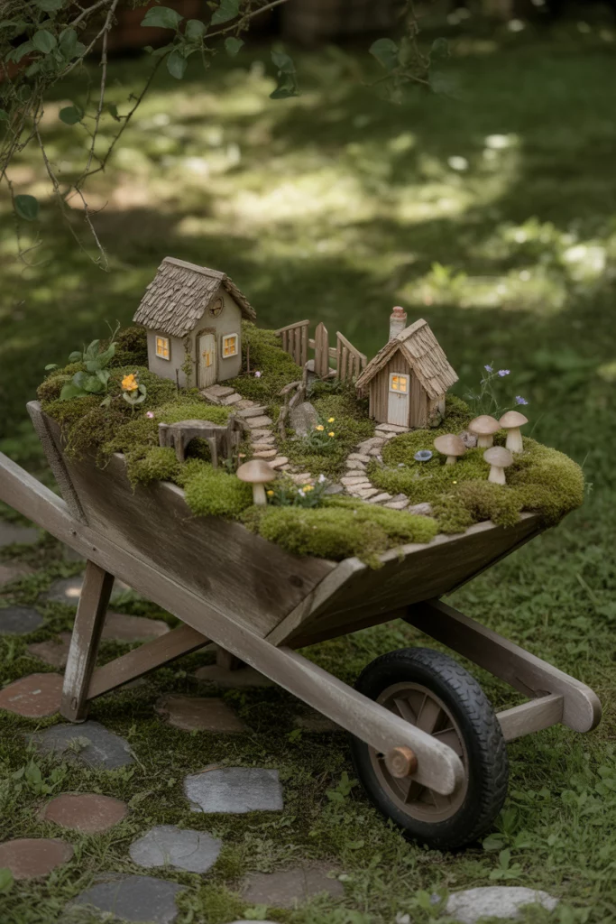 Using a vintage wheelbarrow as a base creates a mobile outdoor fairy garden that can be moved around the yard. Layering soil, moss, and miniature items builds a large whimsical world with plenty of room for creative scenes. This style is great for gardeners who enjoy flexible décor and charming rustic details.
