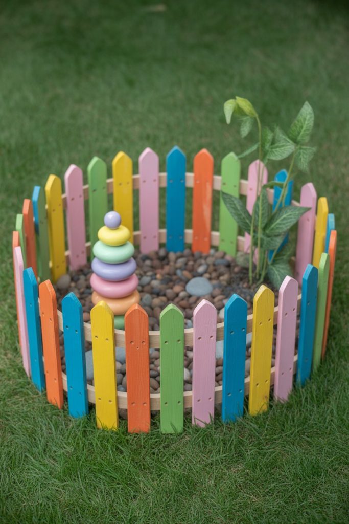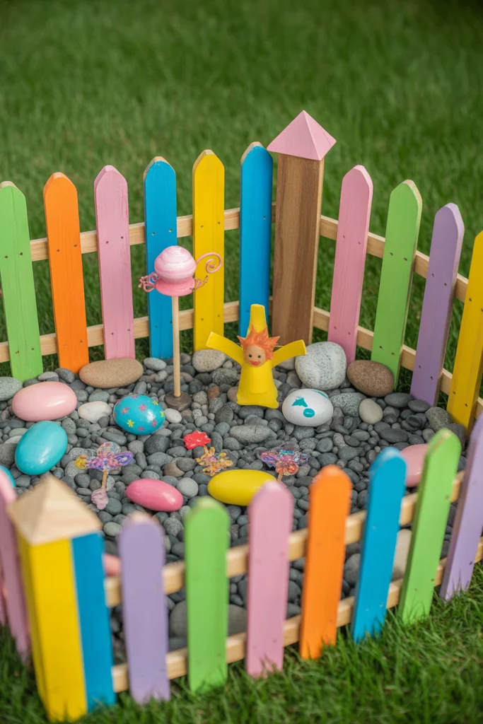 A color-forward fairy garden uses vivid stones, painted popsicle stick fences, and bold accents to create a cheerful, energetic design. Many creators recommend this approach for families with kids, as the bright colors make the scene playful and expressive. It works in pots, trays, or larger outdoor spaces and feels modern and fun.