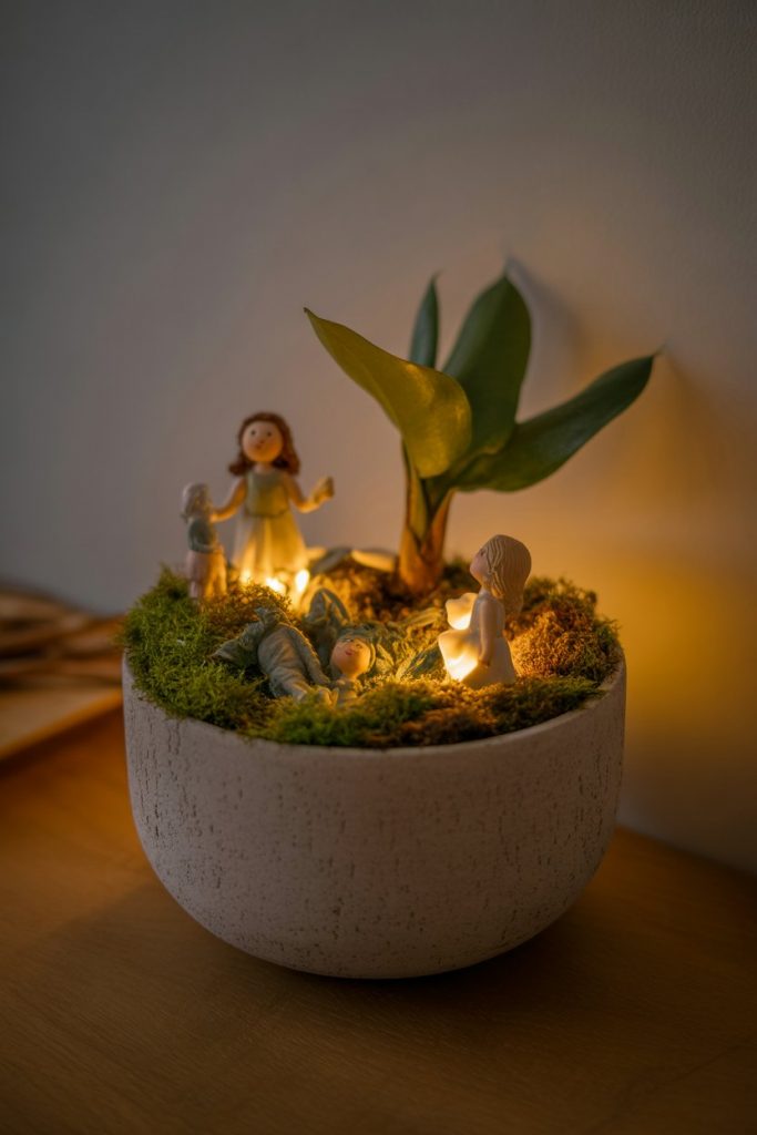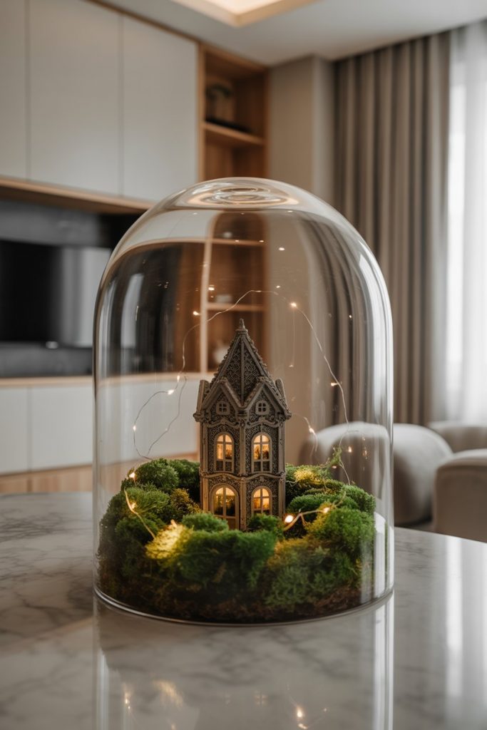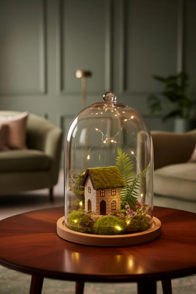 A glass cloche creates a delicate, museum-like display that protects your miniature fairy world while adding elegance. Designers often recommend this indoor style for coffee tables or shelves because it blends sophistication with playful fantasy. Soft moss, tiny lights, and a single fairy house make the scene feel intimate and refined.