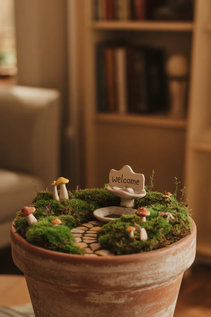 An indoor fairy garden made in a small pot or bowl is perfect for apartments or homes without much outdoor space. This homemade setup uses moss, pebbles, and miniature décor to build a cozy world you can display on a desk or shelf. Many design bloggers note that indoor gardens offer year-round charm and are especially practical for families with kids.
