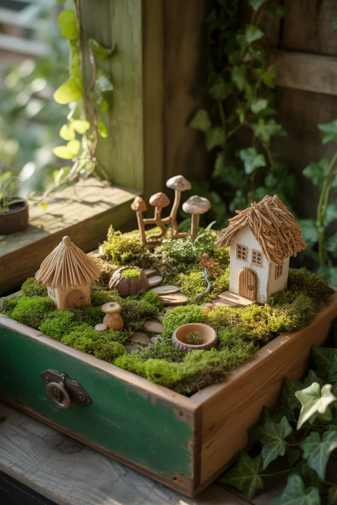 Old wooden drawers can be transformed into charming homemade fairy planters. Filling them with soil, moss, and miniature items creates a vintage-inspired scene that works well on porches or patios. This DIY idea is loved by rustic-decor fans who enjoy giving old furniture new life through creativity and storytelling.