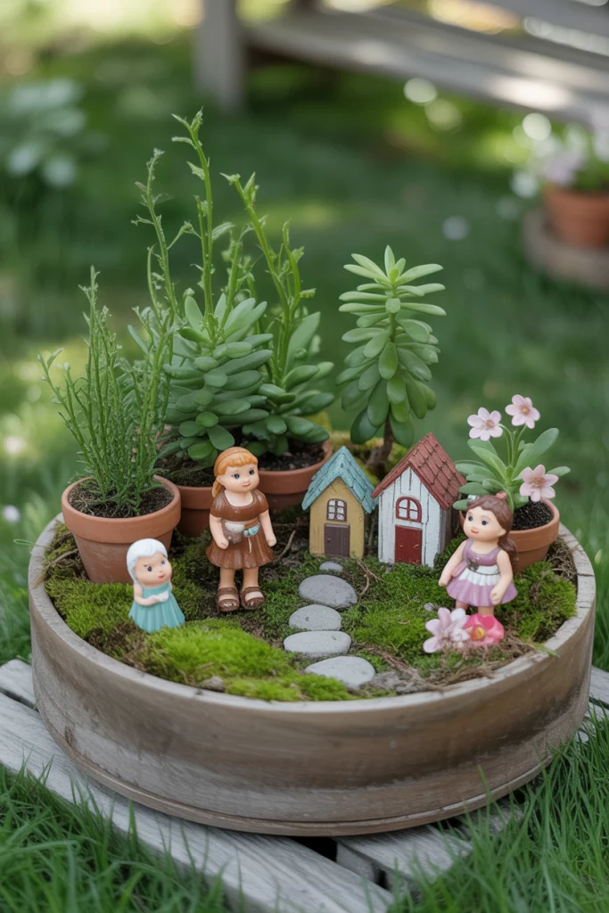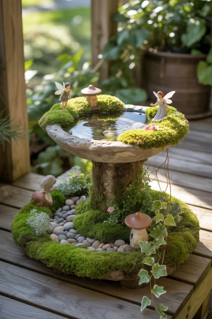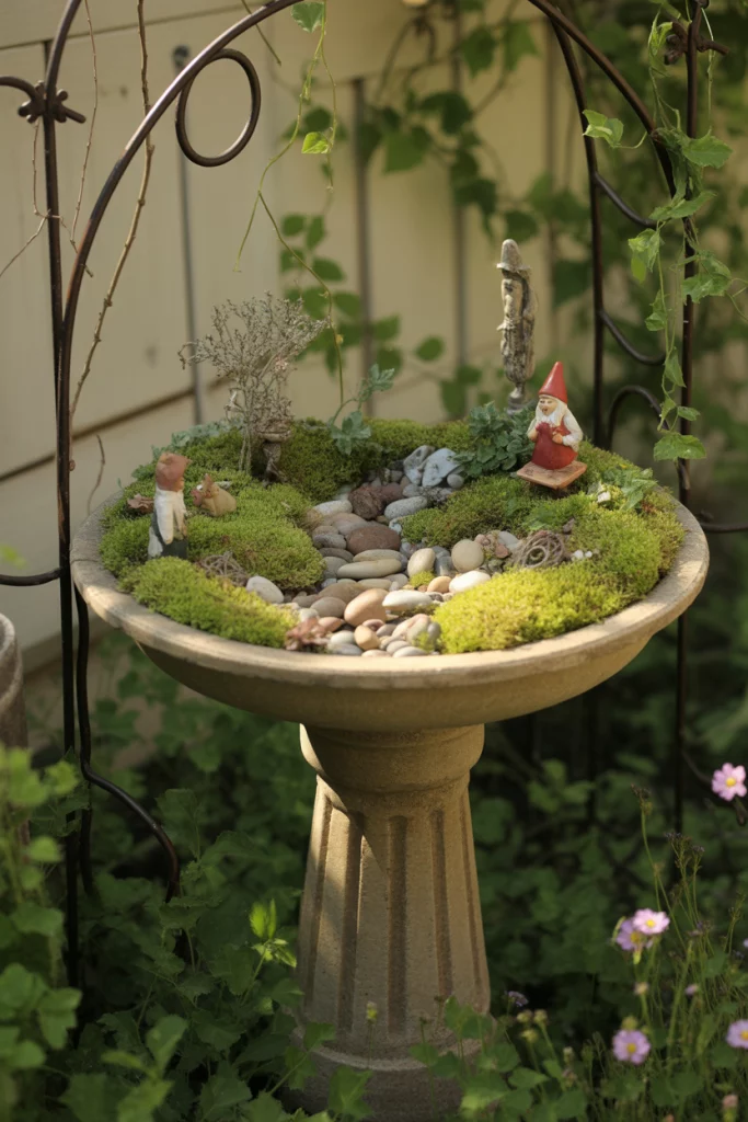 Repurposing a birdbath into a raised fairy garden adds height and a sense of delicacy. The elevation protects the miniature décor and allows you to showcase moss, tiny figurines, and stones at eye level. Many homeowners enjoy this idea because it transforms an unused object into an attractive centerpiece for porches or patios.