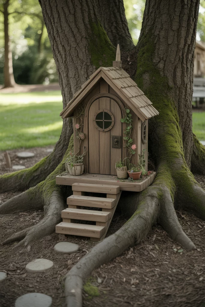 Designing a fairy setup outdoors around a tree creates the feel of an enchanted forest. By adding miniature doors, moss trails, lanterns, and stone steps, the tree becomes a magical focal point children love to visit. Homeowners often mention how this idea naturally blends with the backyard landscape, making it one of the most immersive fairy garden styles.