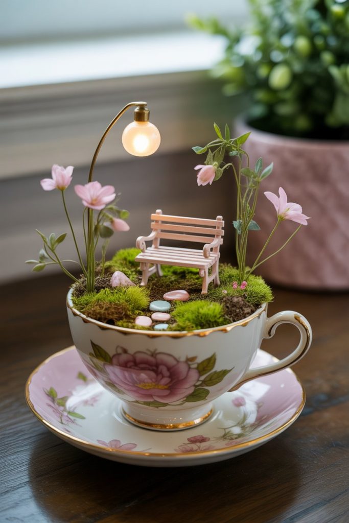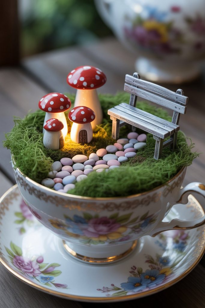 A teacup fairy garden offers a delicate and homemade way to decorate small spaces. Using a vintage cup as the container gives your miniature world personality and charm. A little moss, a tiny bench, and pastel stones create a whimsical scene perfect for shelves, desks, or gifting. Many crafters recommend this idea for its simplicity and elegance.