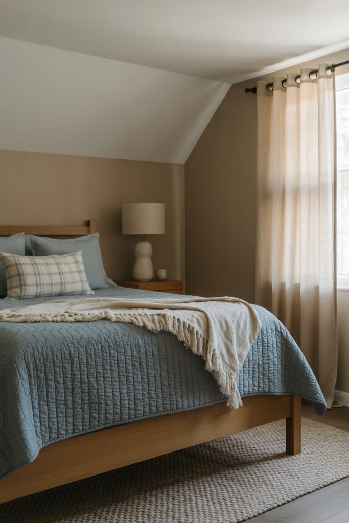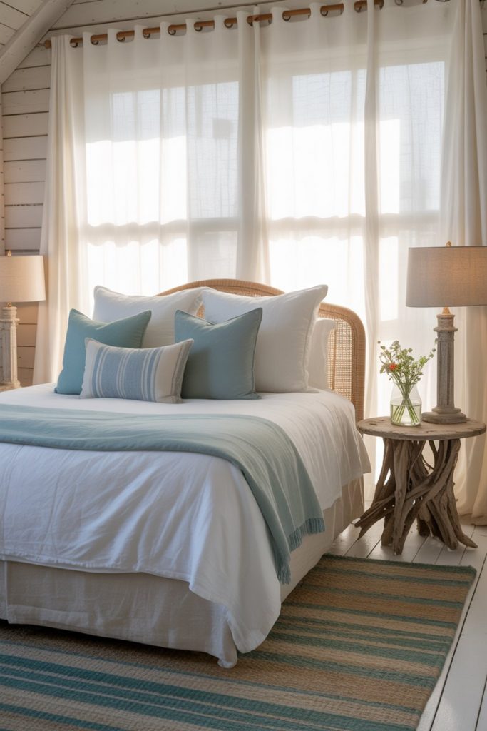 The mix of blue and green tones instantly creates a coastal farmhouse feel. A striped rug, pale sage bedspread, and navy pillows keep the vibe fresh while still cozy and natural. Driftwood furniture ties the look together, perfect for seaside homes or anyone who loves a breezy atmosphere. According to coastal design blogs, the balance of these colors makes rooms feel both lively and relaxing—an excellent choice for small rooms.