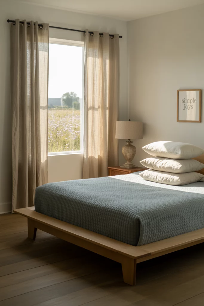 A simple farmhouse bedroom embraces clean lines, uncluttered decor, and functional pieces. By focusing on modern neutrals, crisp bedding, and just one or two rustic features, this look is ideal for those who want farmhouse charm without excess. It works beautifully in small rooms, making them feel more open. Interior sources like Minimalissimo highlight how simplicity in design creates a calm, cozy environment that’s easy to maintain.
