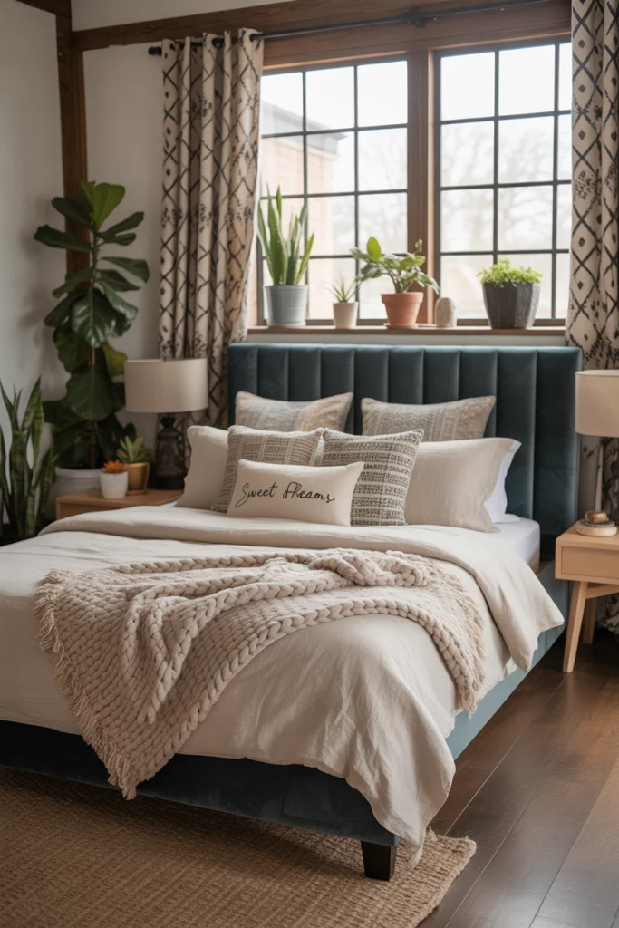 For a modern twist, many younger homeowners are taking inspiration from Bloxburg, the online building game, to design their bedrooms. This trend mixes modern, simple layouts with customizable rustic or boho details. Think a cozy modern farmhouse setup with green plants, layered textiles, and even bold teal or black accents. It’s proof that digital design can inspire real-world decorating, especially for a younger audience.