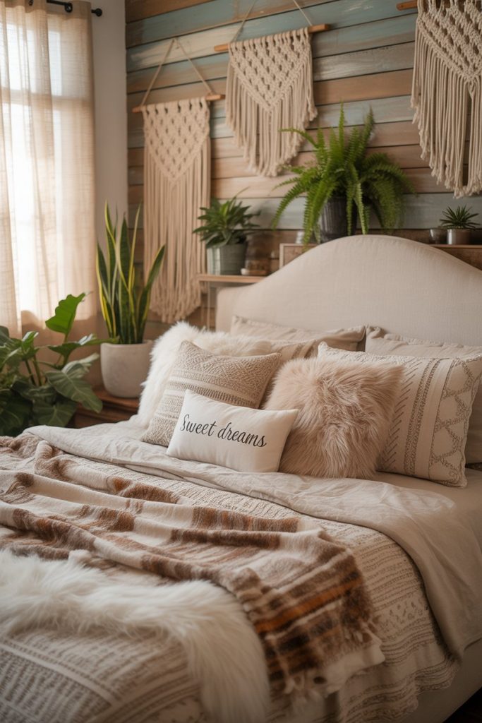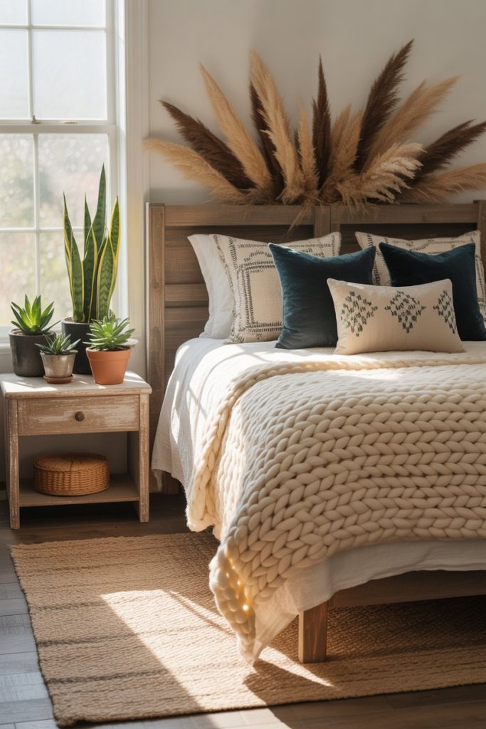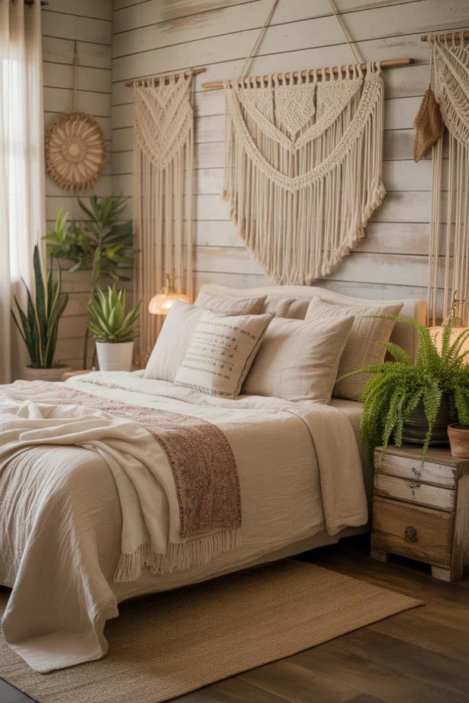 The boho farmhouse bedroom thrives on texture. Woven baskets, patterned quilts, and colorful throws introduce a relaxed bohemian spirit to the rustic backdrop of farmhouse design. Add a few macramé wall hangings and plants to complete the look. This layered approach makes small rooms feel full of life and personality. Designers like Justina Blakeney have popularized this carefree style, blending global influences into farmhouse simplicity.