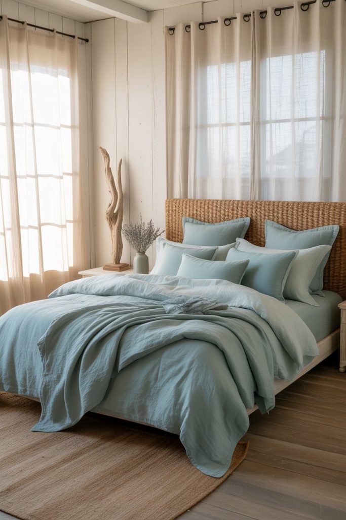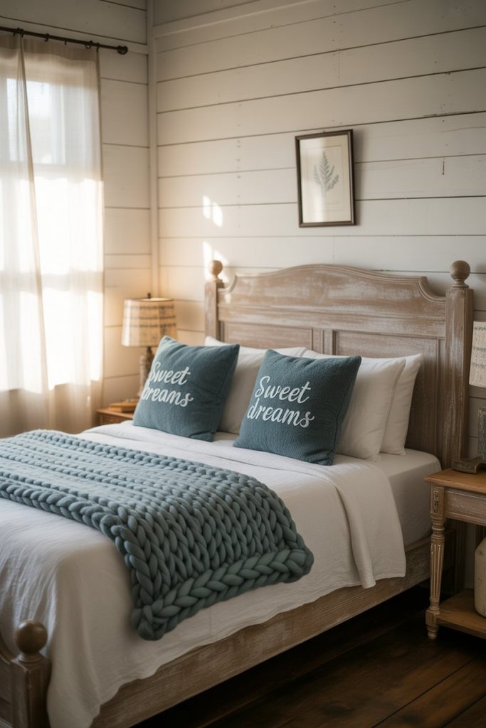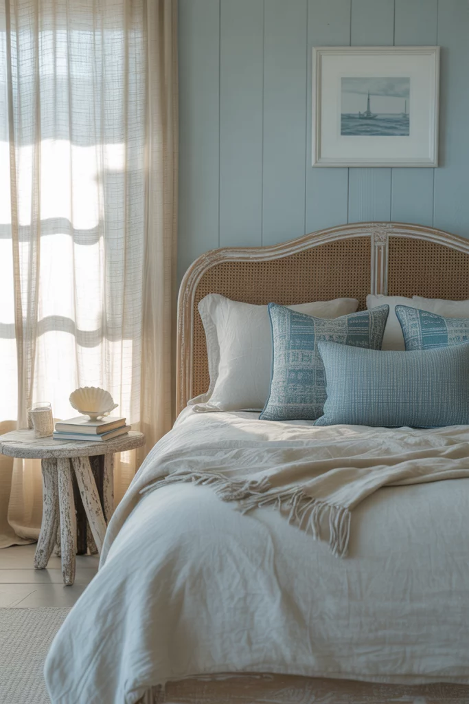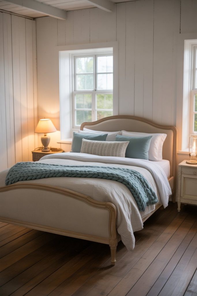 If your dream farmhouse bedroom leans coastal, think whitewashed walls, rattan accents, and breezy fabrics. Shades of blue and teal paired with driftwood and woven textures create a calming retreat. This style is particularly fitting for summer homes or anyone wanting that airy, seaside vibe. The coastal farmhouse has been highlighted on design sites like Apartment Therapy for its balance between beachy relaxation and structured farmhouse charm.