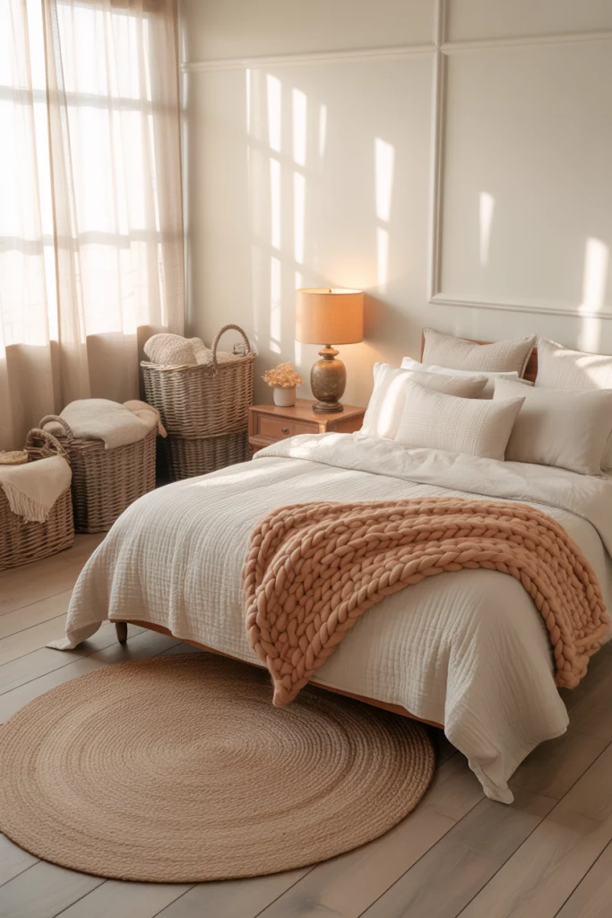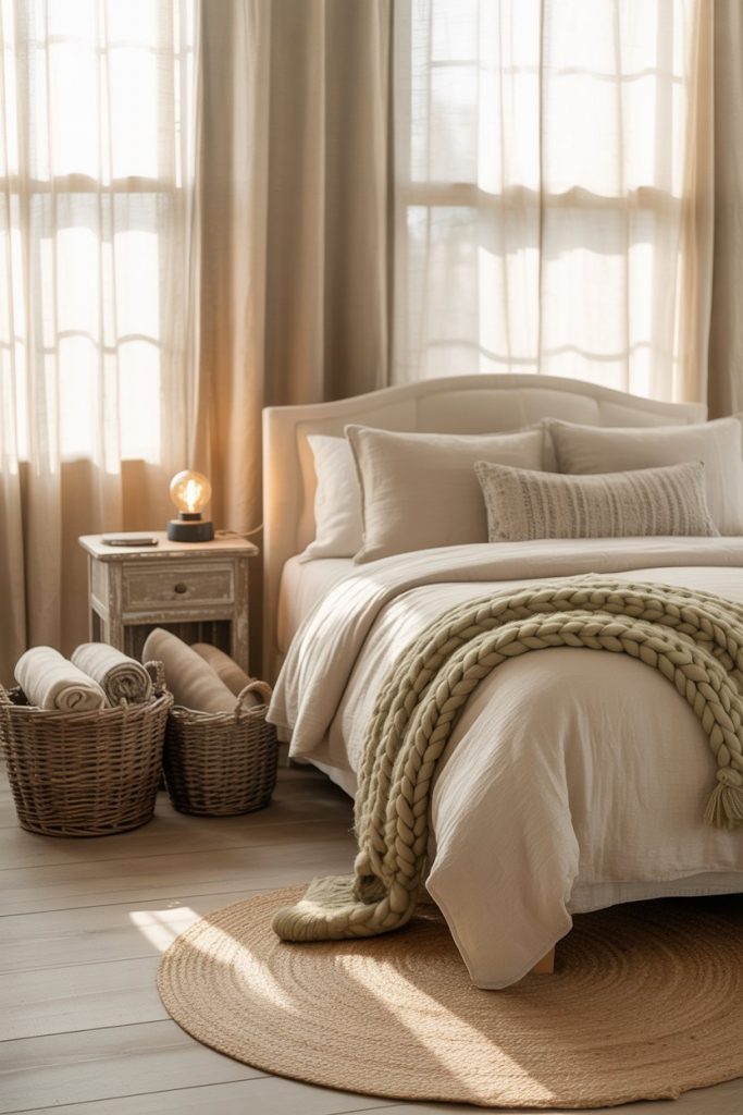 Farmhouse bedrooms look especially inviting when designed with earthy layers. Think jute rugs, woven baskets, linen sheets, and wool blankets, all stacked together in a thoughtful way. This style feels cozy and grounded, perfect for small rooms or guest bedrooms. Modern farmhouse designers like Shea McGee highlight layering as a way to make minimal furniture look intentional and warm, proving that simple texture can transform even the most understated space.