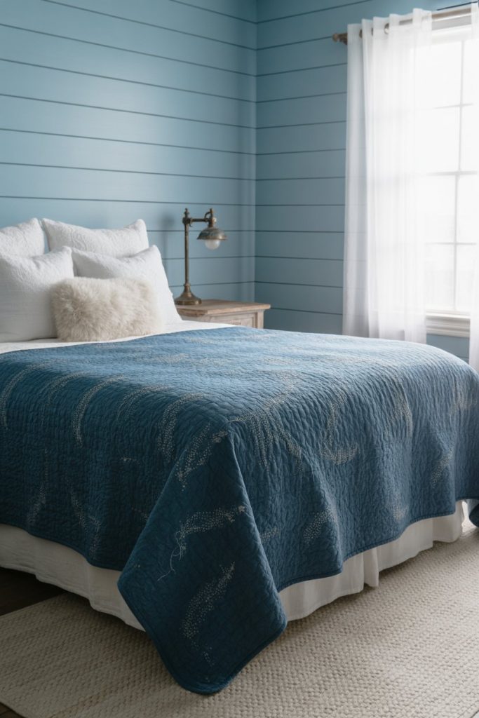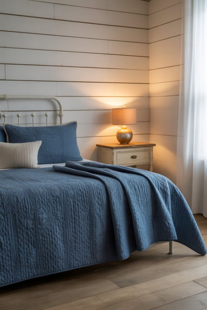 A timeless approach is pairing blue with crisp white in a farmhouse bedroom. This simple yet refined look echoes classic Americana while still feeling fresh in 2026. White shiplap walls, a navy quilt, and vintage-inspired decor pieces create balance between rustic farmhouse and modern elegance. Many interior bloggers point out that this palette works beautifully in small rooms, making them feel brighter and more open.