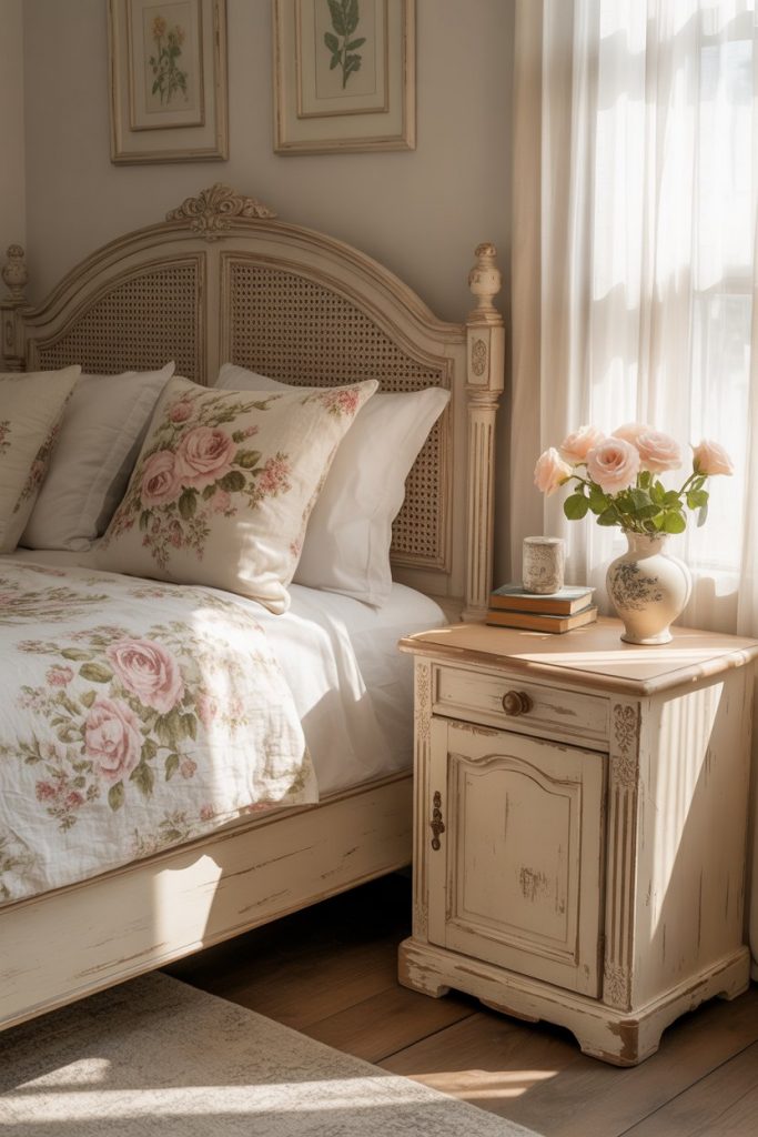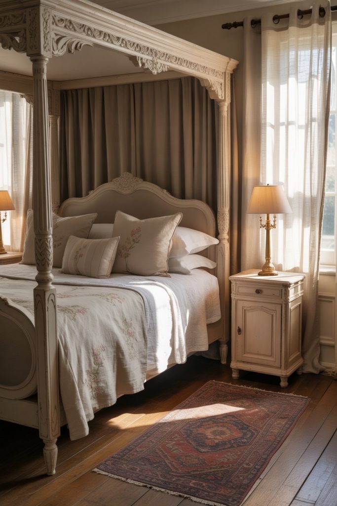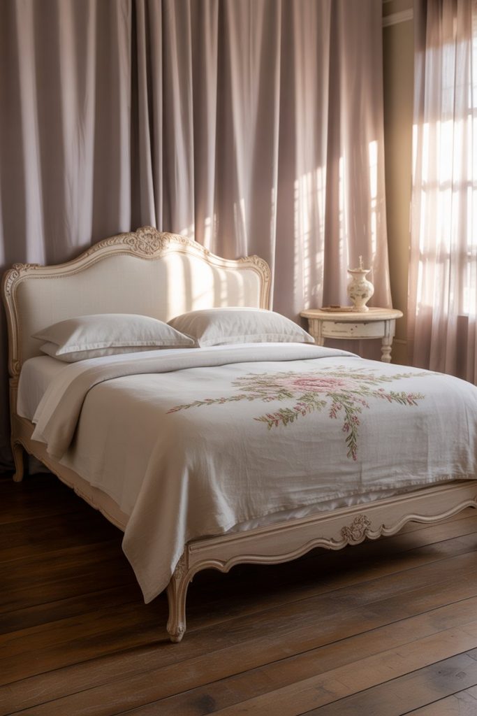 The French provincial influence adds elegance to a farmhouse bedroom with carved wood furniture, flowing drapery, and ornate mirrors. This style bridges vintage farmhouse charm with European sophistication, making it a wonderful option for a master suite. While it leans decorative, keeping a neutral palette of creams and muted pastels ensures the room still feels grounded and cozy. Design experts often recommend mixing antiques with modern comfort to avoid looking too formal.
