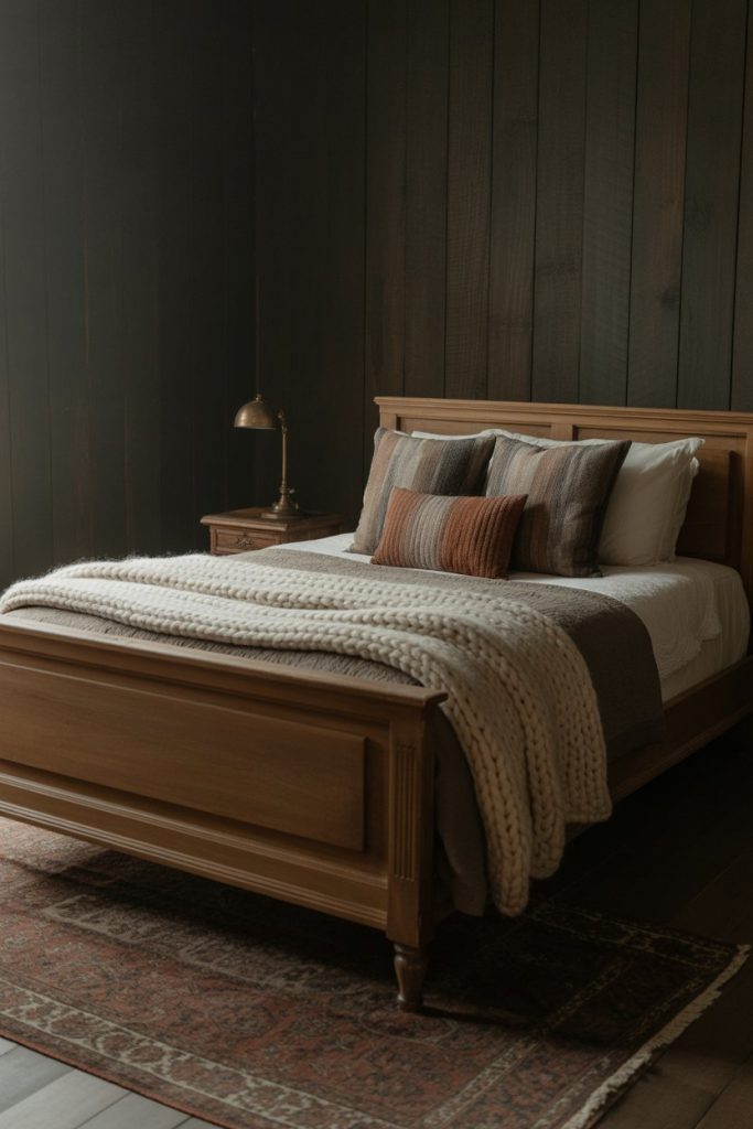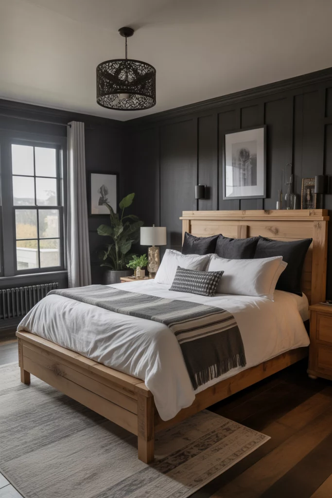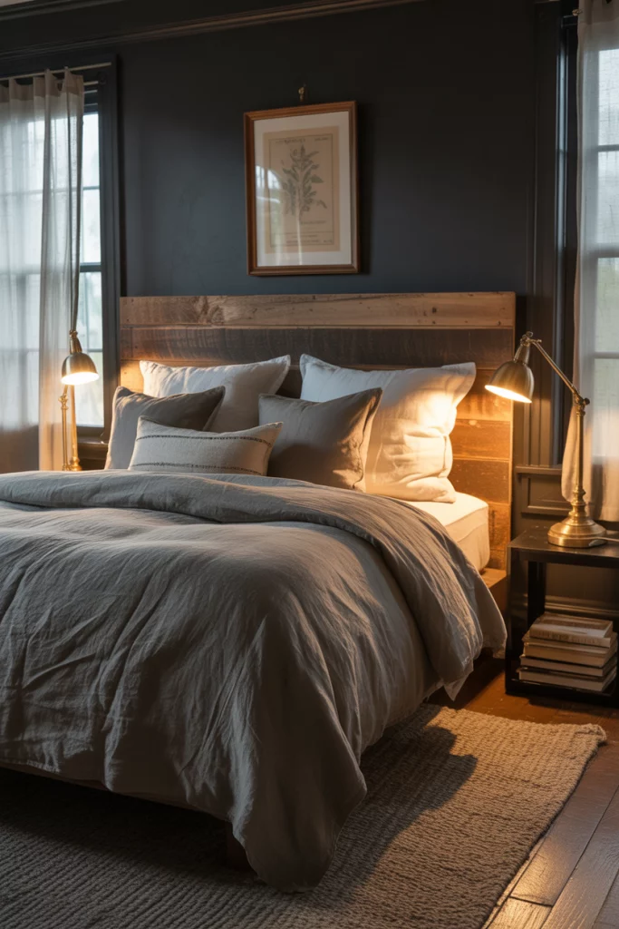 For a dramatic take, moody farmhouse bedrooms lean into dark colors like charcoal, midnight blue, or even black. Pairing these tones with reclaimed wood and brass lighting creates a striking balance of coziness and sophistication. This style works beautifully in a master suite where you can embrace boldness without overwhelming the space. Designers like Emily Henderson note that darker palettes actually make a room feel more intimate.