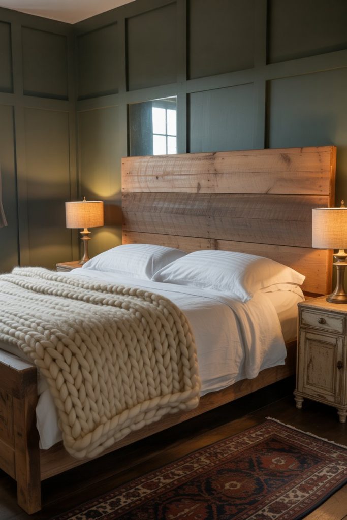 Instead of the soft sage green trend, go bold with moody emerald or forest green tones in the farmhouse bedroom. When paired with reclaimed wood and iron accents, the result feels dramatic yet cozy. This palette brings an earthy depth to a master suite, making it perfect for those who prefer richer environments. Many designers note that deep greens balance beautifully with brass or antique gold details for a luxurious farmhouse look.
