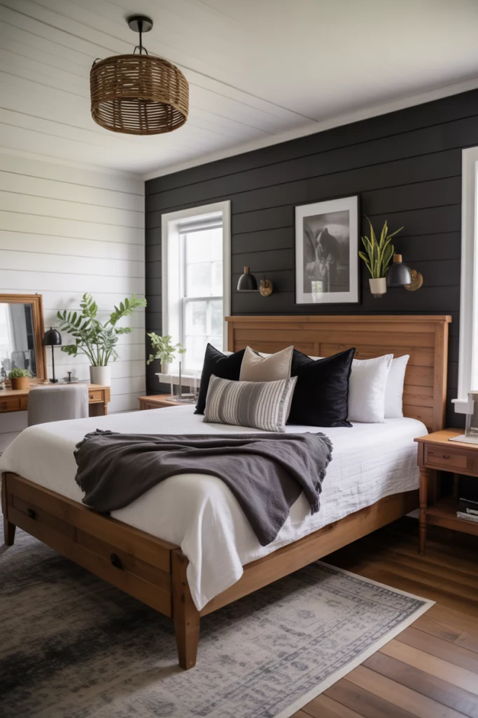 Adding black accents in a farmhouse bedroom creates contrast and a touch of industrial edge. Black window frames, lamps, or bed frames stand out against white shiplap or natural wood, keeping the space modern and grounded. This idea works in both small rooms and larger master suites, offering flexibility while ensuring the space doesn’t feel overly soft. Designers increasingly use black as a way to sharpen the farmhouse aesthetic for 2026.