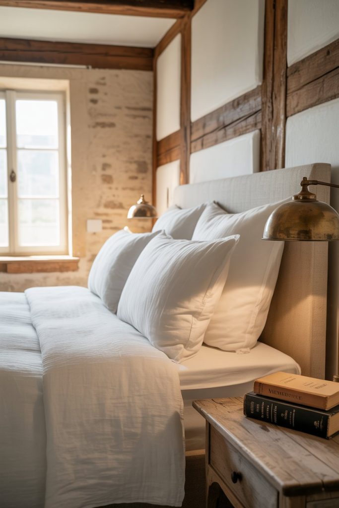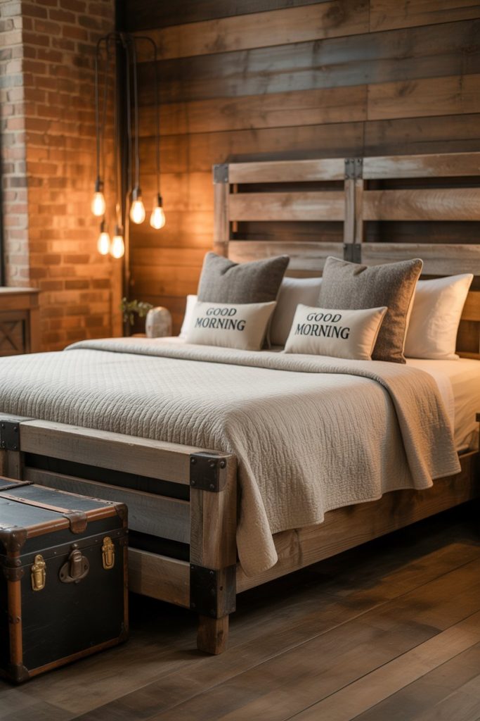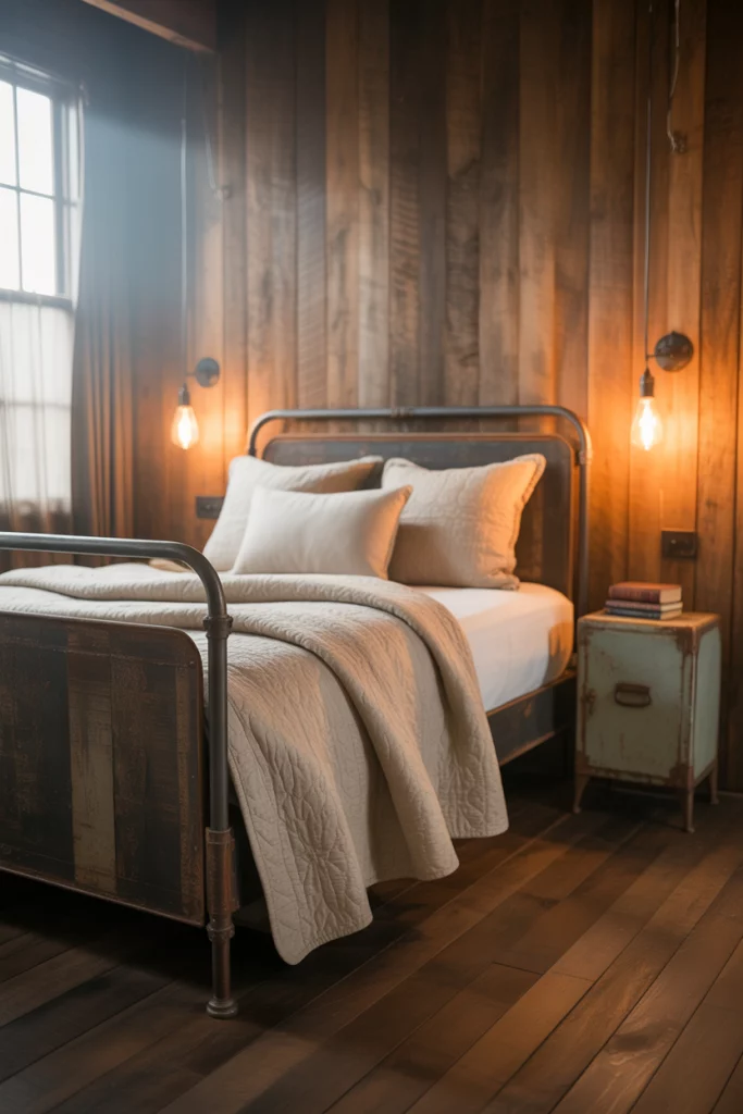 Combining industrial details with rustic farmhouse design is one of the most versatile approaches in 2026. Exposed metal frames, reclaimed wood, and Edison lights meet soft linen bedding for a cozy yet functional style. Perfect for urban lofts or renovated barns, this look suits both small rooms and open-plan master suites. Houzz designers often stress that this pairing balances rough and soft textures, which keeps it from feeling too cold.