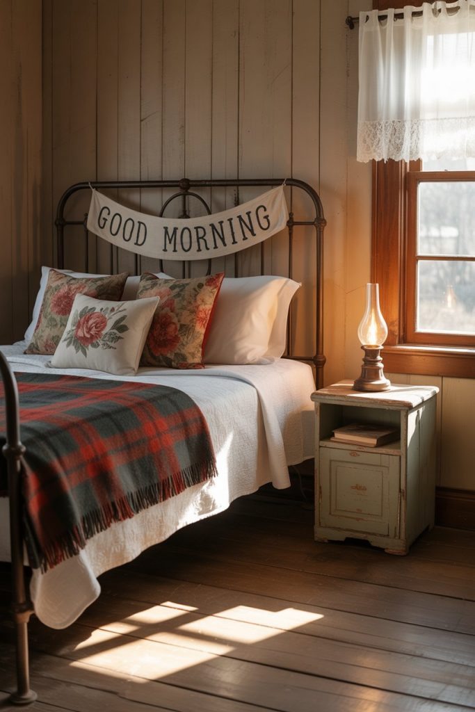 Few things feel more authentic than a rustic farmhouse bedroom with country touches. Distressed wood headboards, plaid blankets, and antique nightstands give the space a lived-in authenticity. If you’re decorating small rooms, this style works wonders since the natural materials bring warmth without requiring excessive decor. Designers like The Inspired Room note that vintage finds from flea markets are often the secret to making this style feel layered yet personal.