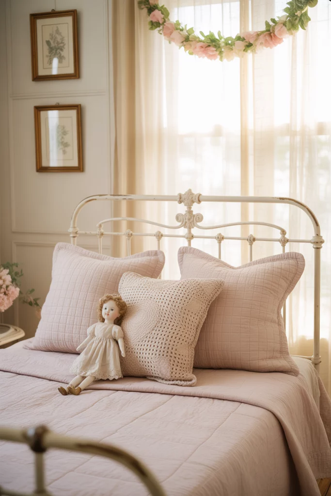 A soft shabby chic farmhouse bedroom with pastel accents feels light, feminine, and timeless. Blush, lavender, or mint add freshness to distressed furniture and vintage linens. This approach is cozy yet delicate, making it a great choice for guest rooms or small rooms where you want a welcoming vibe. Rachel Ashwell’s style guide reminds us that imperfection is beauty, so layering textures and faded fabrics works perfectly here.