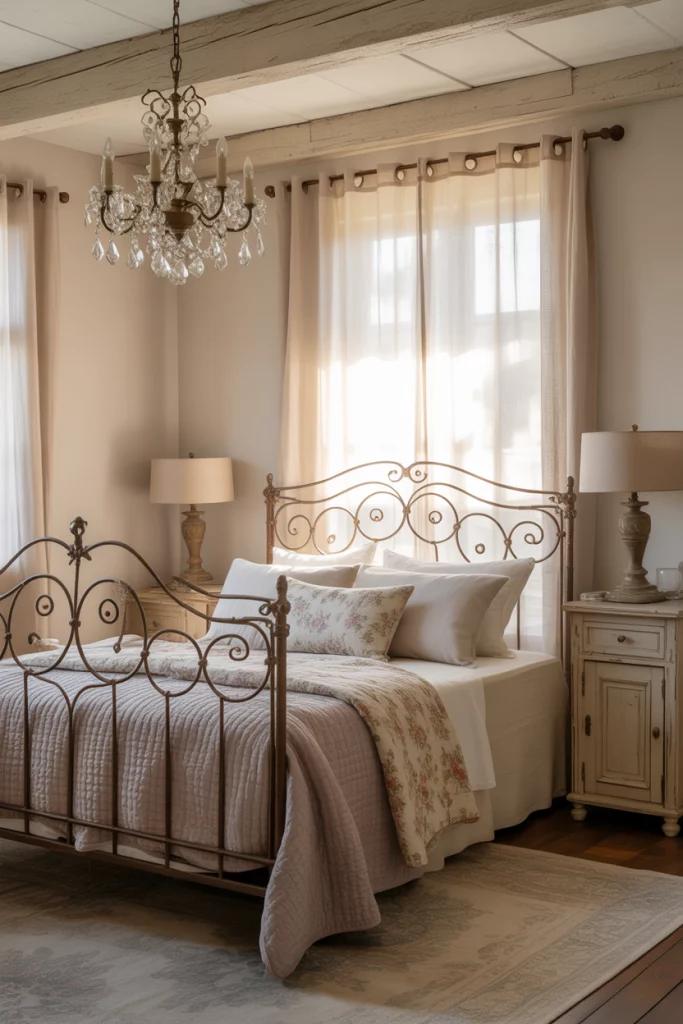 For those drawn to a more European look, a vintage farmhouse bedroom feels elegant and refined. Curved iron beds, crystal chandeliers, and embroidered linens lend a French touch that’s timeless yet fresh. Aged wood floors or exposed beams tie the look together. This approach is especially appealing in master suites, where the scale allows for grand pieces. Designers like Rachel Ashwell, queen of shabby chic, often mix elegance with imperfection for a perfectly imperfect farmhouse style.